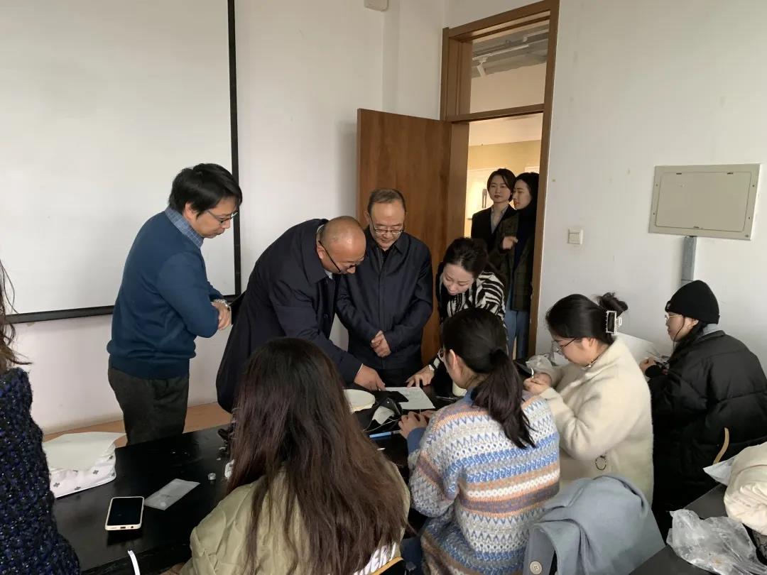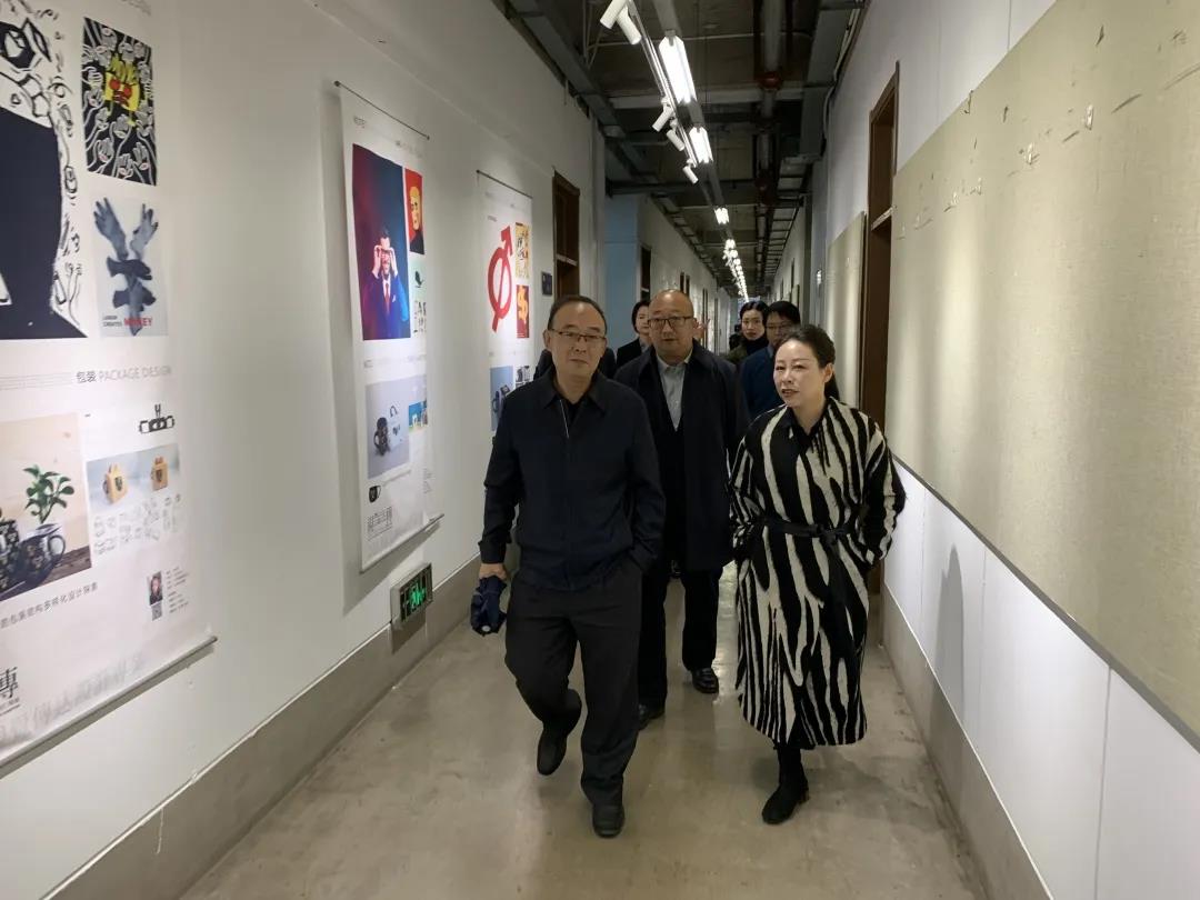 校领导一行先后参观我院文化走廊两侧学生结课作业展、教学空间以及艺术展厅作品展,详细了解我院整体规划、功能布局等情况。 高宇宏结合优秀学生作品详细介绍各专业发展以及作品的整个制作过程和使用工艺。领导们仔细聆听,近距离观察作品,对学院实践教学成果给予充分肯定。在参观过程中,吴刚书记亲临我院戏剧影视美术设计班教学课堂,与师生在课上进行交流互动,进一步了解教学工作开展情况。