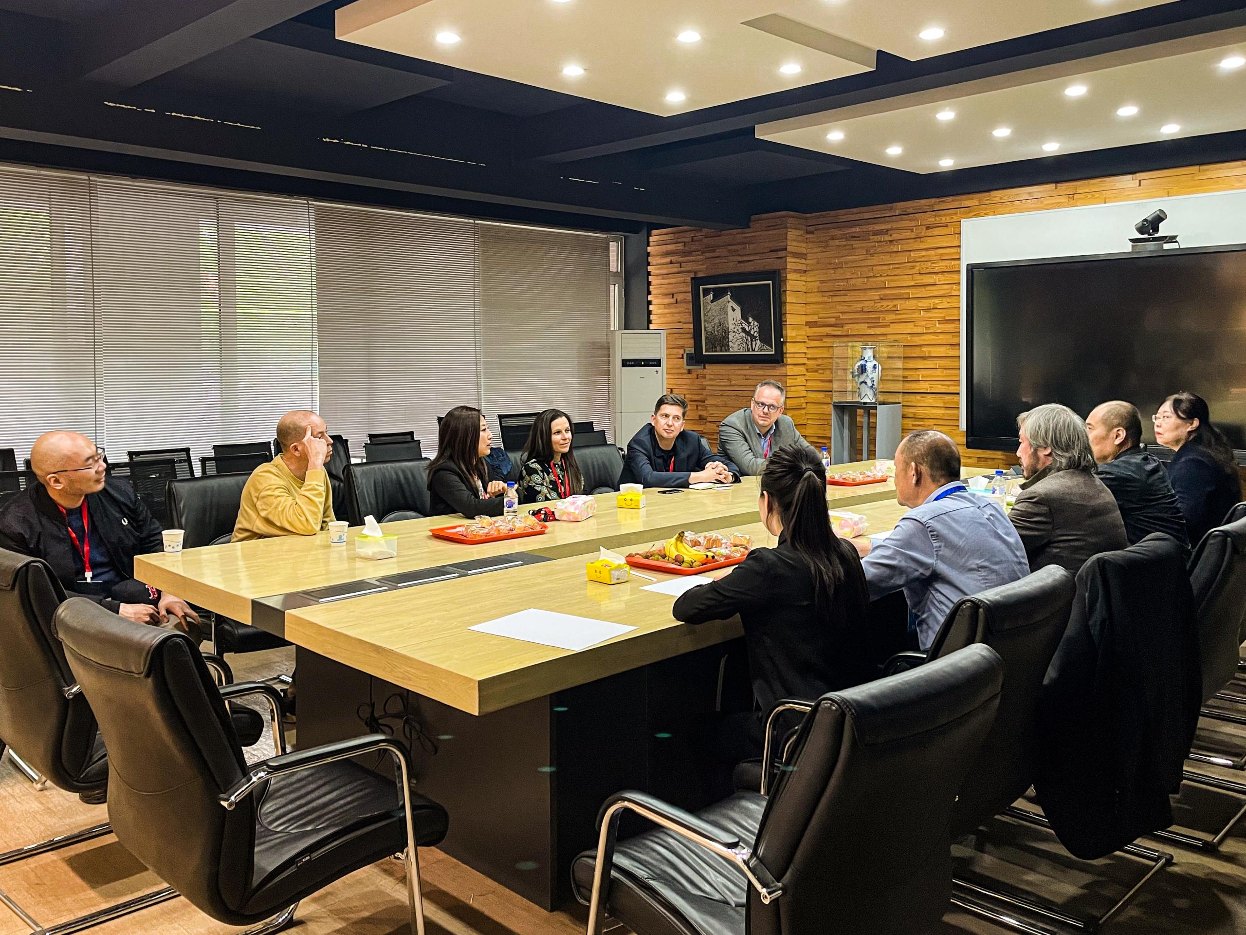 期间,就高层次人才引进工作,刘锐一行与清华大学美术学院博士研究生导师张月教授、布达佩斯城市大学校长、匈牙利国立佩奇大学博士院院长巴赫曼·巴林特教授、匈牙利国立佩奇大学信息工程科学院院长高比·瑞拉教授、布达佩斯城市大学艺术与创意学院院长皮特副教授、佩奇大学工程与信息技术学院副院长马克副教授进行座谈。刘锐介绍了学校发展历程和近十年来取得的成就,以及学校高质量发展的目标、方向和路径。重点介绍学校求贤若渴的引才理念、优质服务的引才政策。衷心希望引进以王铁教授为负责人的环境艺术设计高层次人才团队助力学院高质量发展。同时,就与匈牙利国立佩奇大学博士院和布达佩斯城市大学开展校际合作进行座谈交流。