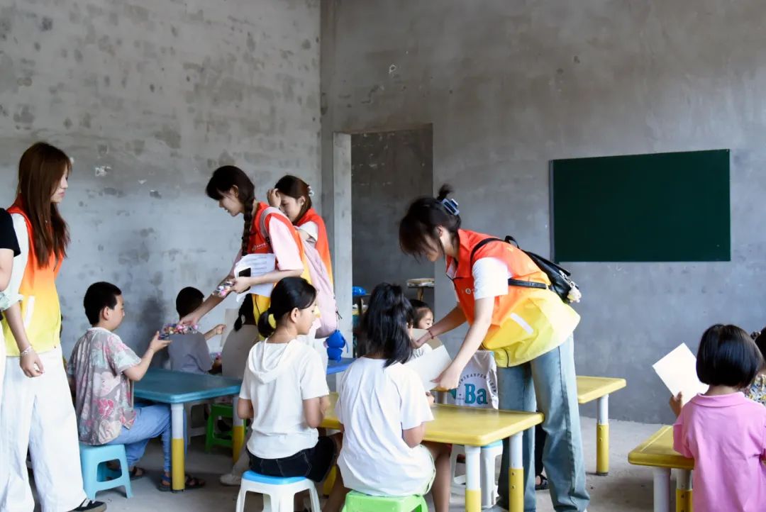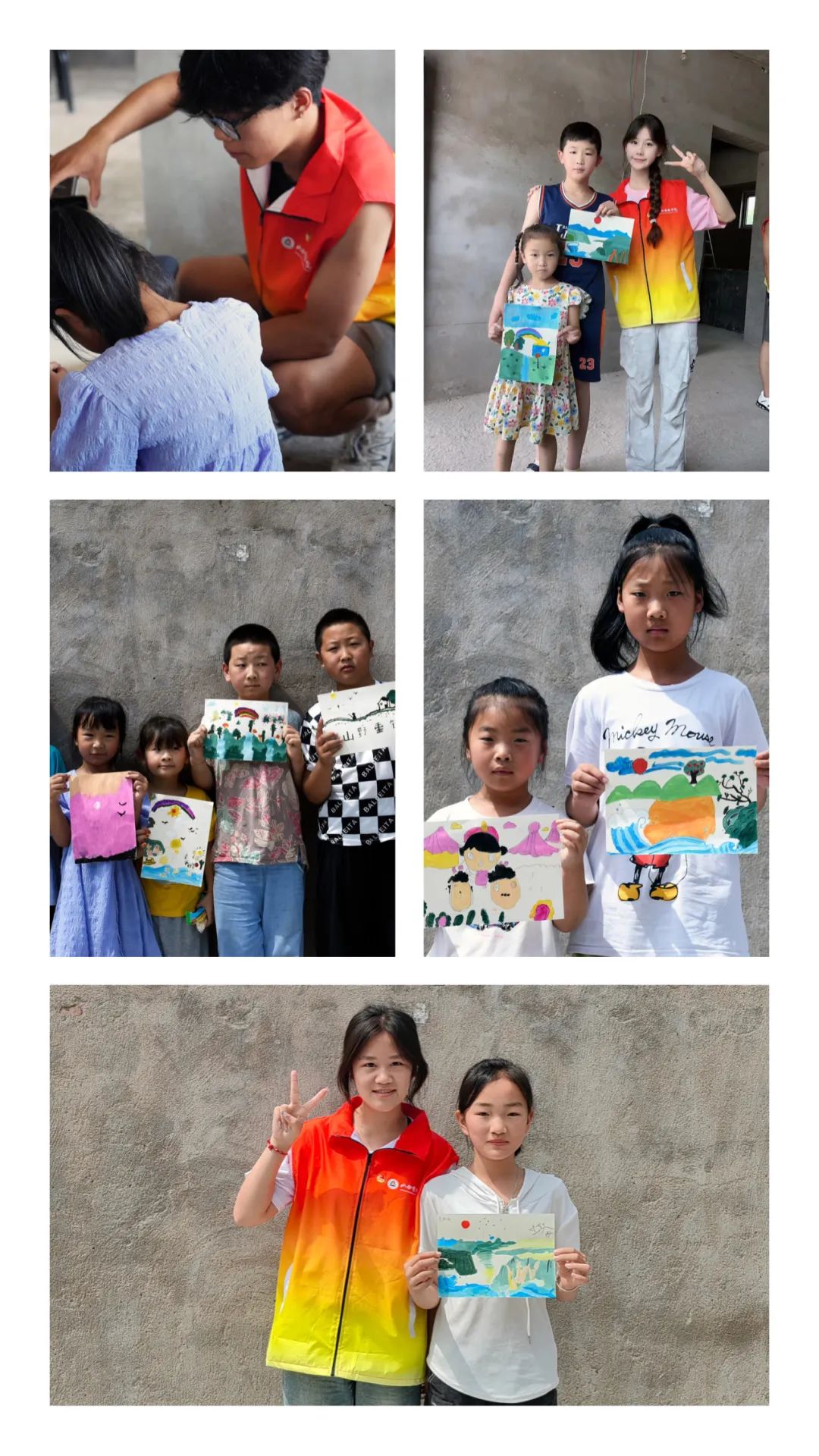 随后,队员们为小朋友分发颜料、画笔和画纸,引导小朋友们以“我的家乡”为主题进行美术创作。过程中,志愿者在旁辅导小朋友们画画,帮助他们进行调色、寻找素材等,培养孩子们的艺术兴趣和创造力,增强他们对家乡的认同感和归属感。最后,志愿者为孩子们的画作进行整理拍照,并发放了糖果饼干等小礼品,让孩子们在艺术创作中得到乐趣和成长。