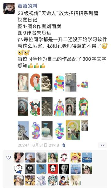 · 晚上:检查与辅导作业。随着时间的发展以及参观元素的积累,学生们的作业质量突飞猛进。教师做好工作日志同时23级视传的讲好本土故事视觉日记作品得到各高校教师认可点评。