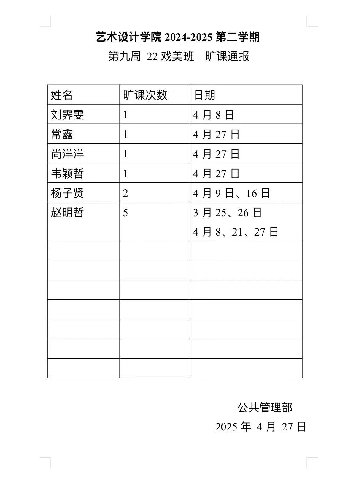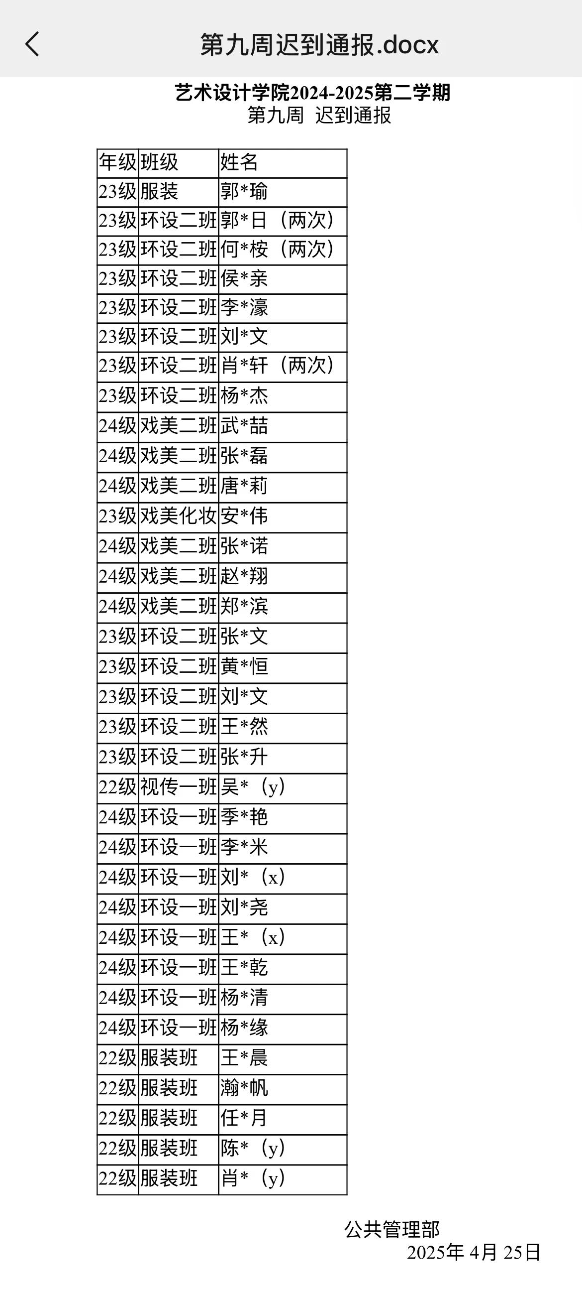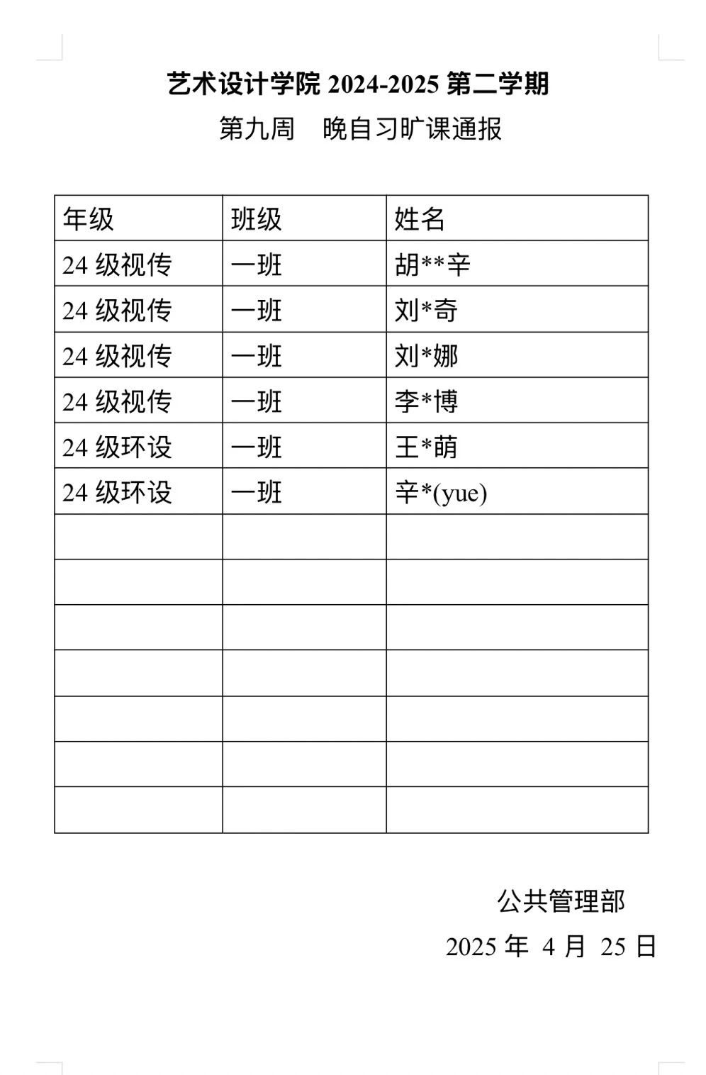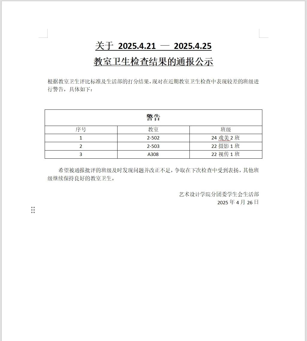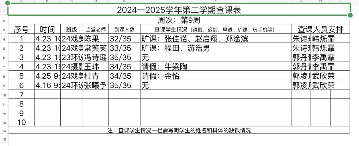 为营造"求知向善、勤勉好学"的学习氛围,构建"安全和谐、文明规范"的校园环境,我院学生会紧抓学风建设工作,深入反馈巡查效果,现将2024-2025学年第二学期第九周学风与文明行为规范巡查情况通报如下: