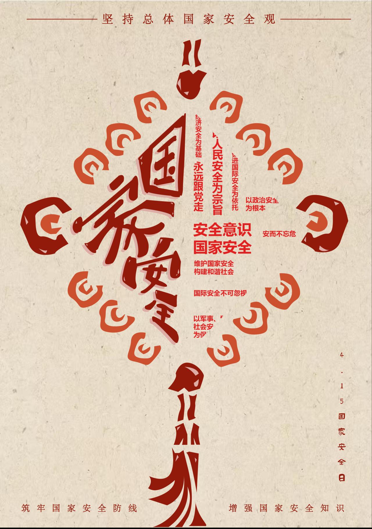 设计理念:该海报设计以“坚持总体国家安全观,筑牢新时代安全防线”为核心,将笔墨化作战士形象,隐喻文字与文化在国家安全领域的守护力量。整体设计通过古今呼应,展现新时代每个人都是国家安全防线的“文化战士”,号召以思想与行动筑牢全民安全屏障,守护国家长治久安。