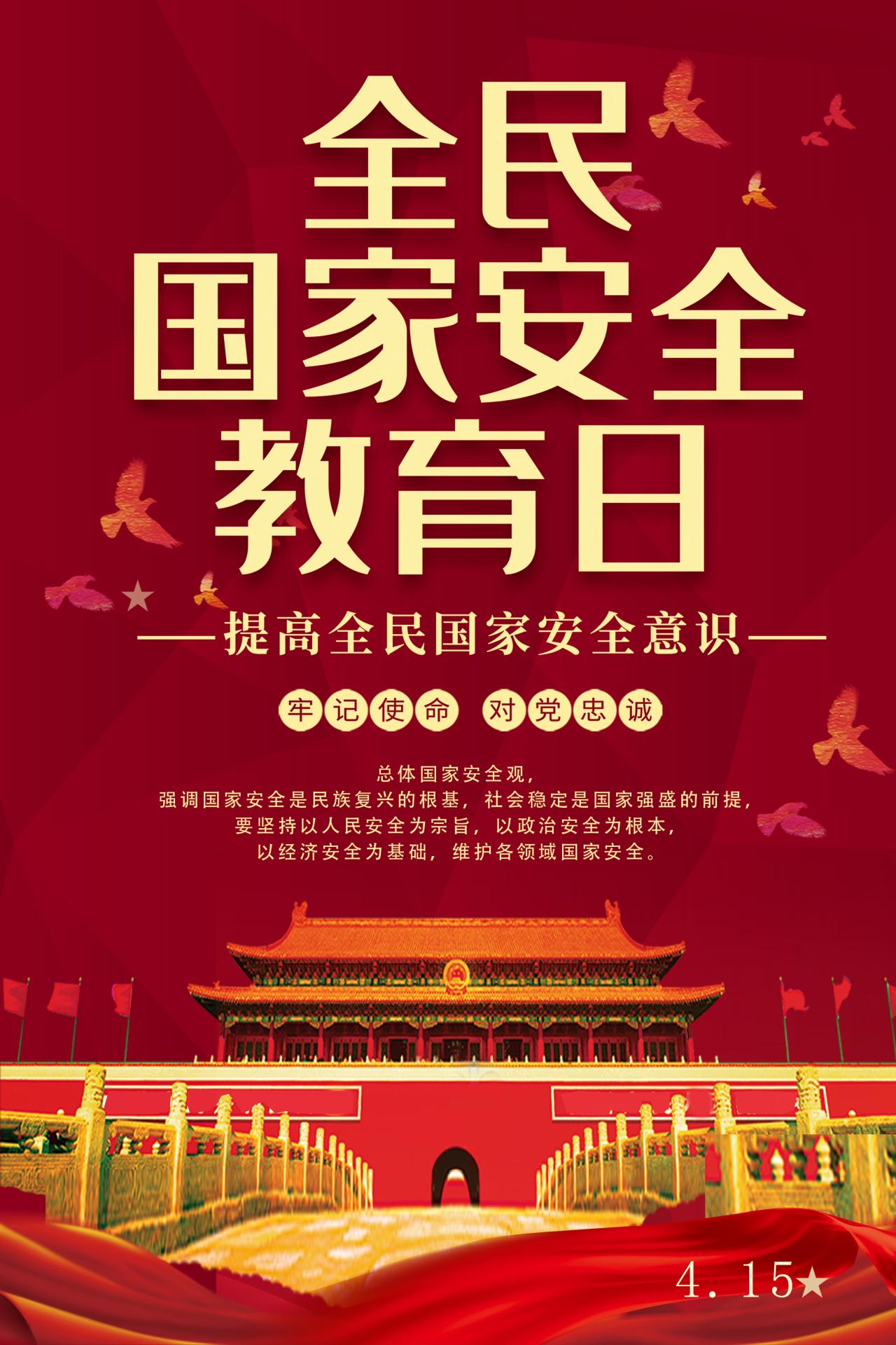 设计说明:海报以“全民国家安全教育日”为主题,聚焦“总体国家安全观”,通过深蓝与红渐变色调象征安全与忠诚。顶部五星盾徽强化主题,中央立体文字突出“国家安全是民族复兴根基”,底部融合“4·15”标识与飘带,呼应全民参与。设计以简洁色块与层级标语,传递国家安全与个人命运共同体理念,唤起公众守护责任感。