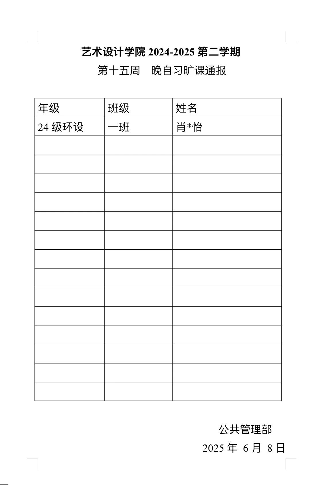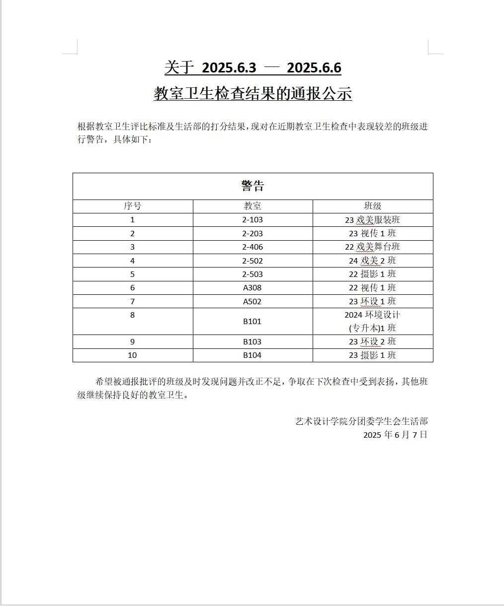 为营造"求知向善、勤勉好学"的学习氛围,构建"安全和谐、文明规范"的校园环境,我院学生会紧抓学风建设工作,深入反馈巡查效果,现将2024-2025学年第二学期第十五周学风与文明行为规范巡查情况通报如下:
