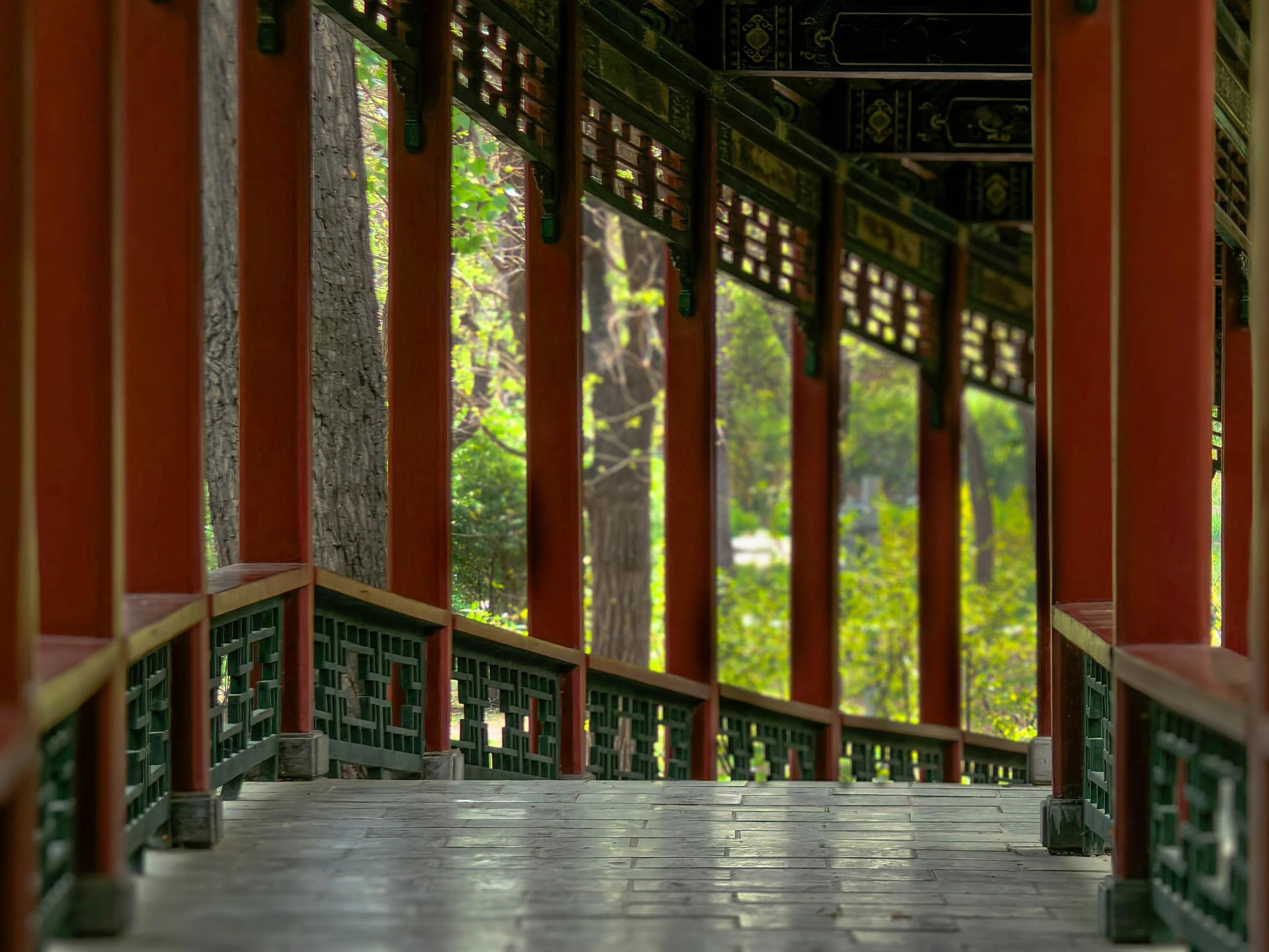 《朱廊幽径:绿意中的古韵长廊》