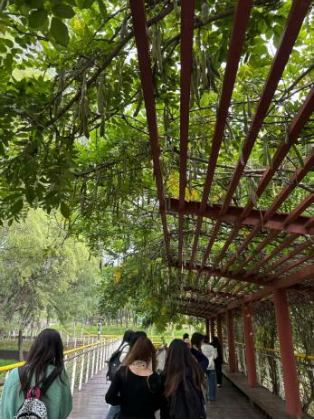 最热闹的当属互动研讨环节,同学们分组选取园区内的景观节点,尝试用环境设计的视角分析其优缺点:有的小组关注溪谷旁的休憩平台——“这里的木质座椅虽然契合自然风格,但雨季易受潮,或许可以采用防腐木与石材结合的材质”;有的小组聚焦林下步道——“步道的宽度刚好适配两人并行,但坡度稍陡,增设防滑纹理会更人性化”。老师肯定了同学们的思考,并补充道:“自然园林的设计核心是‘平衡’——平衡生态保护与人类活动,平衡自然肌理与人工干预,这和环境设计‘以人为本、尊重在地’的理念是完全一致的。”同学们也在研讨中发现,园林造景与环境设计有着异曲同工之妙:都需要兼顾功能、美学与在地性,只是园林更侧重与自然的共生。