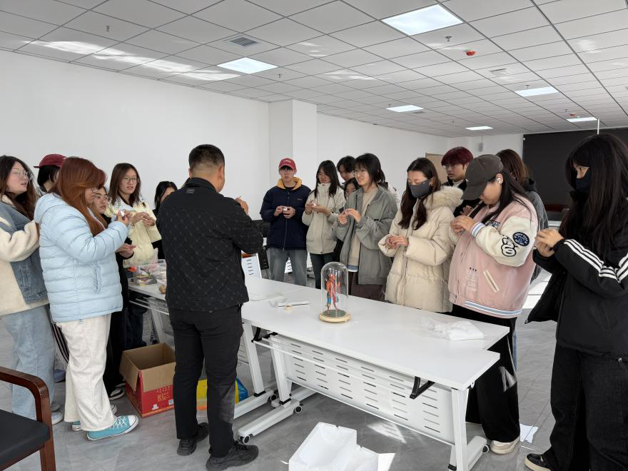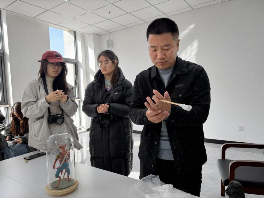 在技艺展示环节,张琨老师系统解析了面塑的制作材料与工艺技法。他介绍,面塑以糯米面为主料,调成多种色彩,然后通过手和一系列专业工具塑造出各种栩栩如生的形象。伴随着细致的讲解,张老师现场演示了面塑制作的全过程,只见他手中的面团经过揉、搓、挤、压、团、挑、按、拨、拍等一连串娴熟动作,短短十几分钟就变成了一个形神兼备的精彩人物形象,让在场的同学们叹为观止。