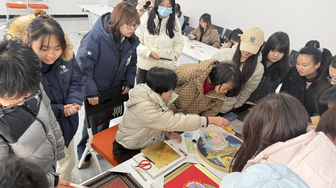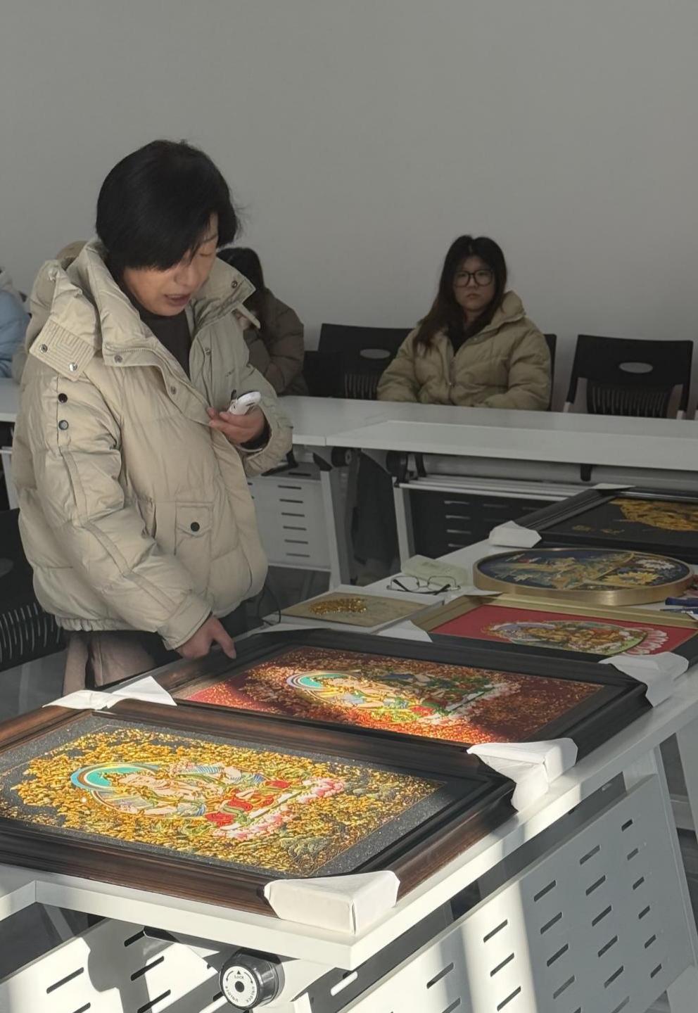 活动伊始,李丽君老师系统梳理了掐丝珐琅画的历史脉络与文化价值。她谈到,掐丝珐琅古称“铜胎掐丝珐琅”,源于元代,盛于明清,曾是宫廷专属的御用工艺,如今已褪去皇家光环,成为兼具艺术价值与装饰功能的民间瑰宝。李老师结合自身三十余年的从业经历,向同学们阐释了这项技艺在山西的传承脉络:“山西的掐丝珐琅画融入了晋商文化的厚重与晋派建筑的精巧,既有铜丝勾勒的刚劲线条,又有釉料晕染的温润质感,是材质与技艺的完美契合。”她展示的《义薄云天关云长》《十里莲塘》等主题作品,让同学们直观感受到掐丝珐琅画在表现地域文化题材上的独特优势。