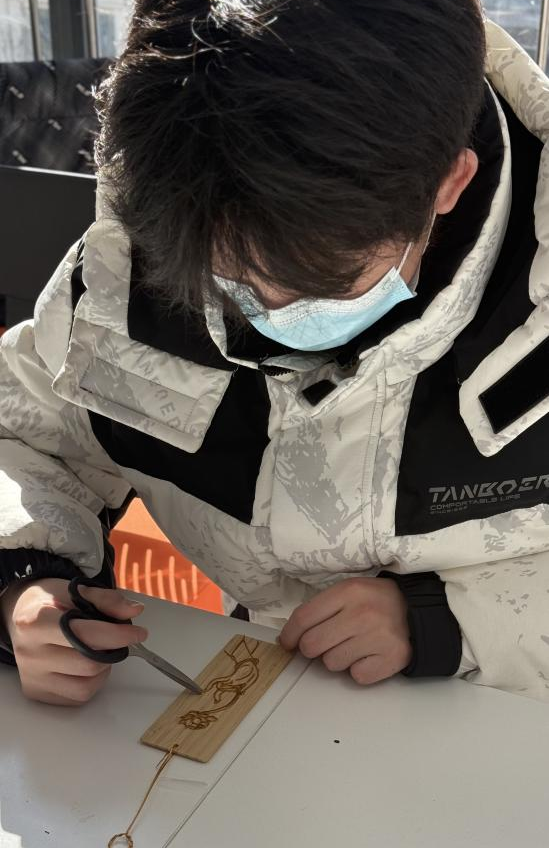 到了最热烈的互动实践环节,同学们分组领取铜丝、釉料、底板等工具,在李老师的指导下开启创作。从勾勒简单的几何纹样到尝试传统的缠枝莲图案,起初还有些拘谨的同学们逐渐进入状态。“铜丝弯角要圆润,别太生硬”“蓝色釉料要从浅到深过渡,这样才有立体感”,李老师穿梭在各组之间,手把手纠正技法。环设专业的王同学在创作中发现:“掐丝时的比例把控和空间设计中的尺度感完全一致,而点蓝的色彩搭配,和我们做室内软装配色的逻辑也相通。”李老师听闻后笑着回应:“传统工艺从来不是孤立的,你们的专业知识能为非遗注入新活力,这正是传承的意义。”她分享自己的创新实践:将掐丝珐琅元素融入现代装饰画、屏风设计,让这项古老技艺走进寻常百姓家。