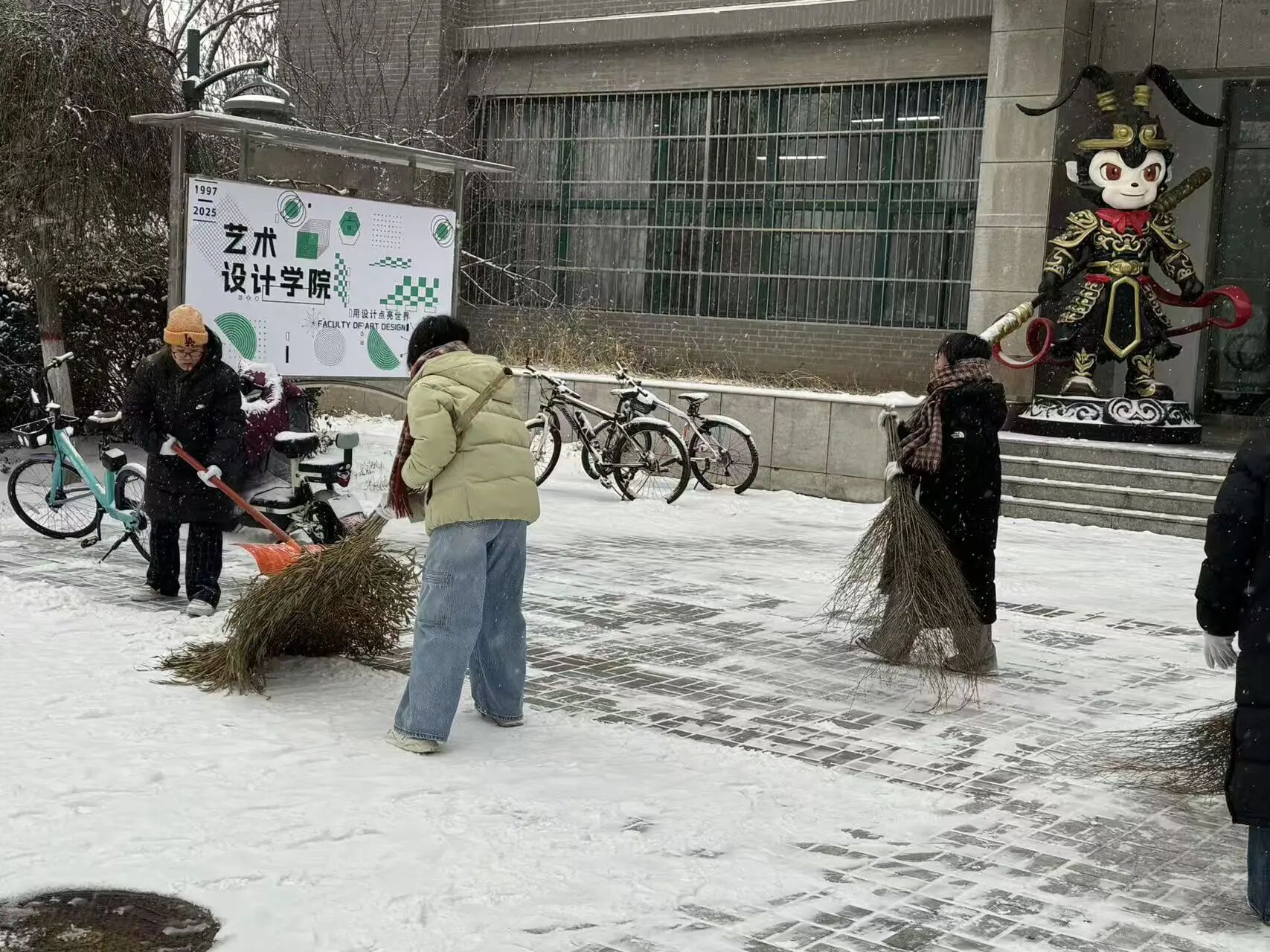 现场一派热火朝天,铁锹撞击地面的“叮叮当当”声、扫帚扫雪的“簌簌”声交织。教职工们弯腰铲冰、合力清雪堆,用行动传递暖意。尽管天寒,大家热情不减,艺术学院党组织书记葛雯与副院长曹宇老师始终与师生并肩,从主干道到辅行路,从台阶缝隙到墙角角落,细致清理每一处积雪积冰,确保不留死角。