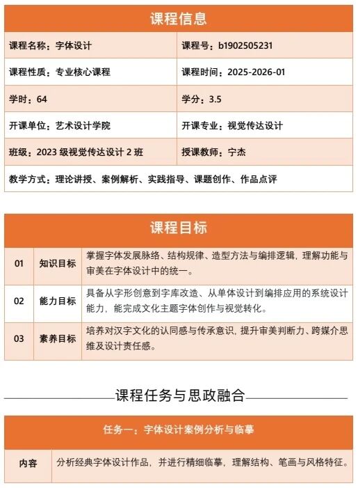 字体设计作为视觉传达设计专业的核心基础课程,是连接文字信息与视觉表达的关键纽带,对培养学生的文字创意能力、视觉审美素养及文化传承意识具有不可替代的作用。本课程通过理论讲授与实践创作相结合的教学方式,引导学生系统掌握字体设计的基础理论与创作方法,完成系列实践作业并汇总成规范画册。