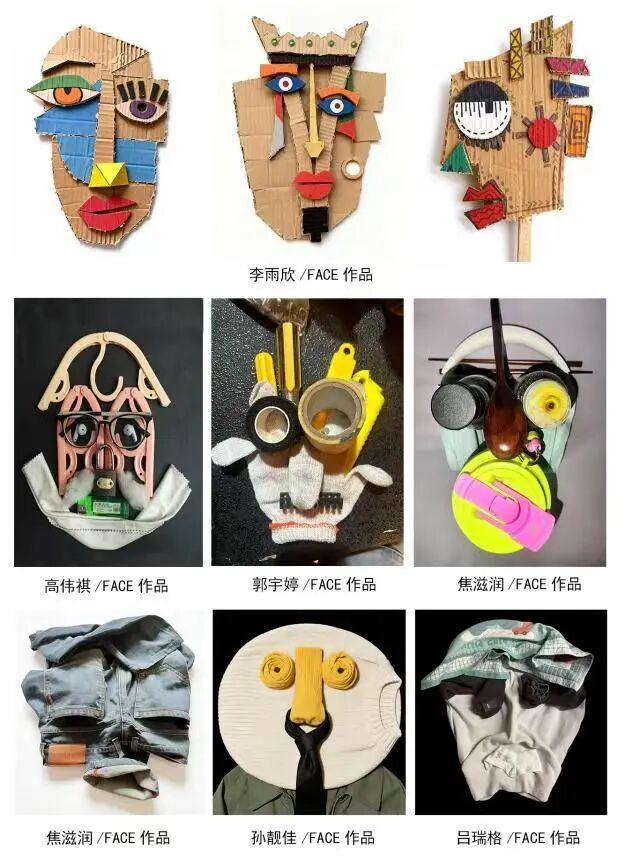 在综合材料的重构设计中,学生们以“形色的脸、有趣的物”为主题,利用日常或废弃材料的物理特性,能够按需挑选并通过多组系列作品来展示。从单件作品的精雕细琢到系列作品的全局把握,学生们平衡了主题表达的趣味性与作品的一致性,增强了审美判断力和对材料的驾驭能力。