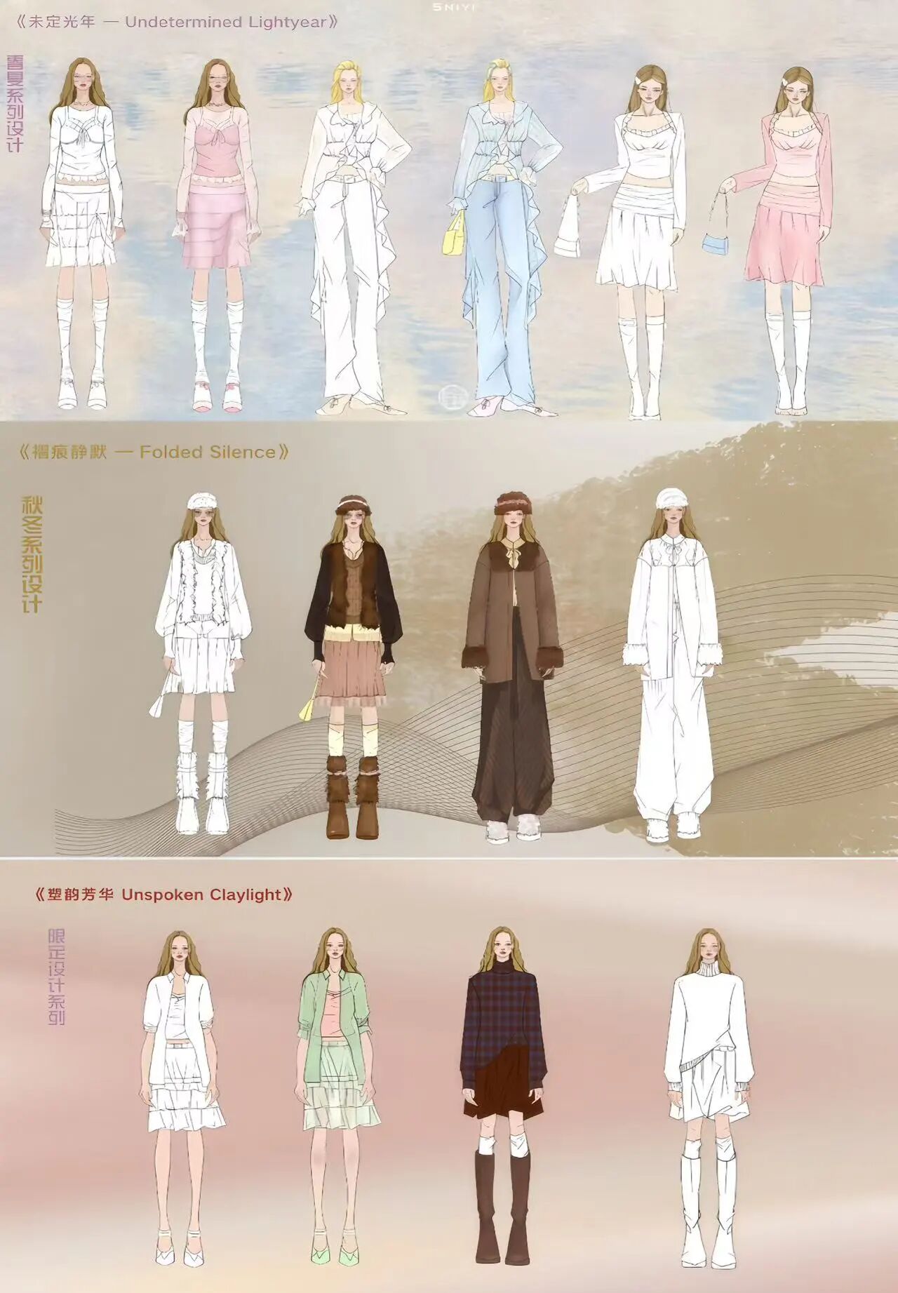 《服装品牌设计与企划》课程紧密融合设计学与市场经济学,旨在培养学生系统的品牌战略思维与前瞻性的市场洞察力。课程以模拟创建服装品牌为核心,引导学生立足时尚产业前沿,并结合 2026 年时尚趋势预测完成了两季服装产品企划,实现了从理论到实践的专业能力提升。在创作过程中,学生们不仅成功将山西非遗元素进行了创造性转化,推出了“非遗限定”时装系列,更积极探索 AI 虚拟技术在设计呈现中的应用,大幅提升了作品的表现维度与专业完成度。这充分展现了学生融合文化、商业与科技的综合素养,为未来应对时尚与创意产业的数字化变革奠定了坚实基础。