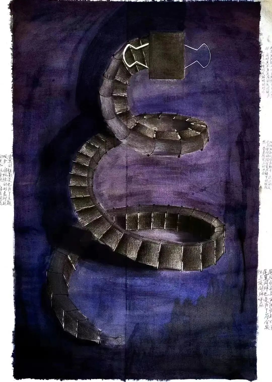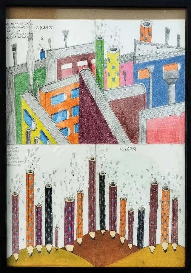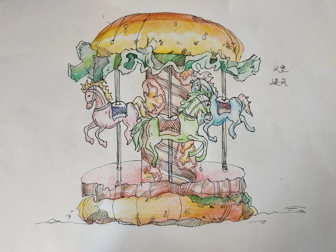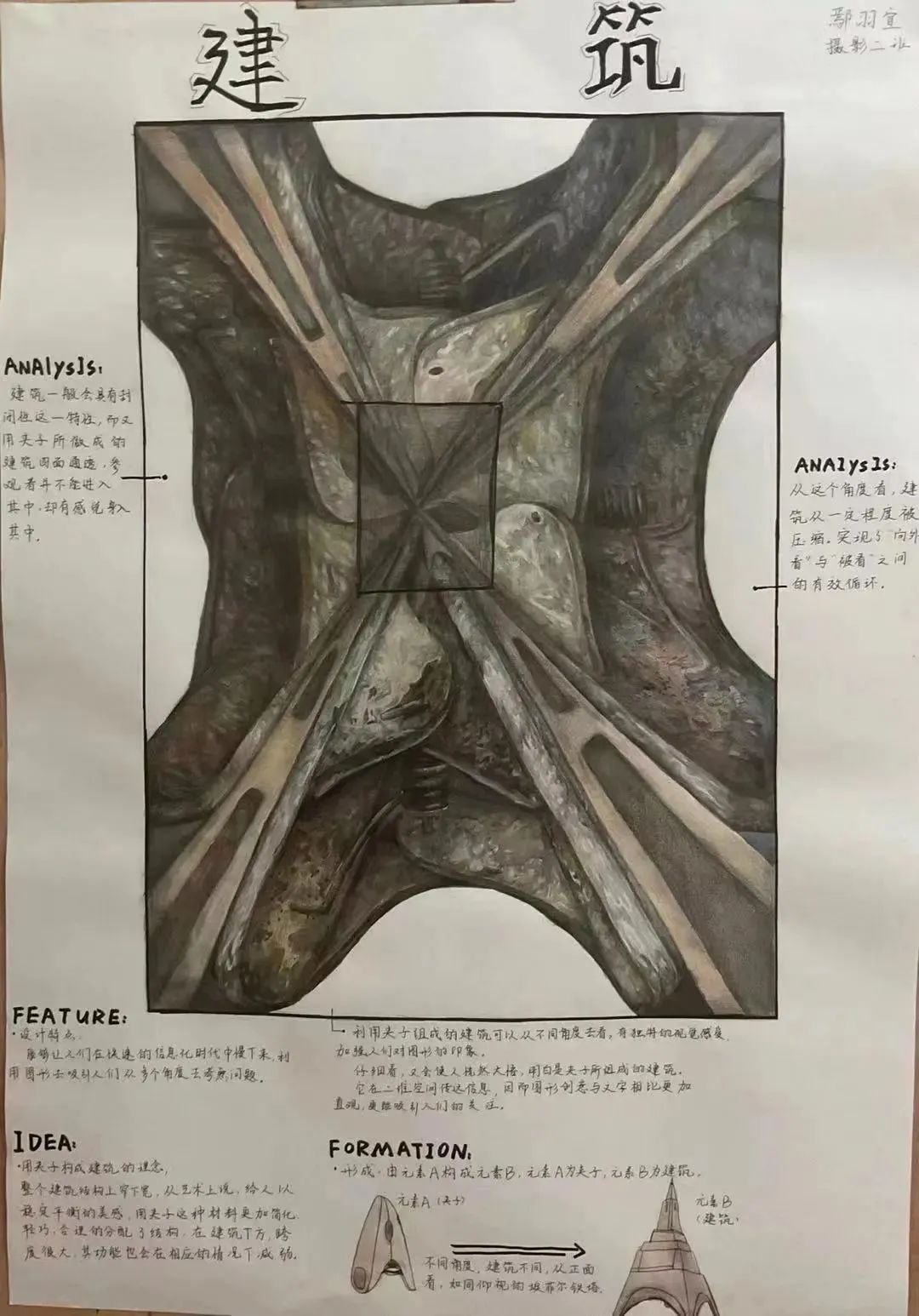 设计说明:作品是以元素A为夹子,元素B为建筑,利用了夹子A元素的真实面貌组合成新的建筑,可以从不同角度看,利用夹子做的这个建筑比一般建筑更具有通透性,仰视从建筑底下看,不在建筑里,又感觉身处建筑中。在作品中着重刻画夹子的细节,使其贴切,利用彩铅以及水彩的工具,让人们在图像化的时代驻足。