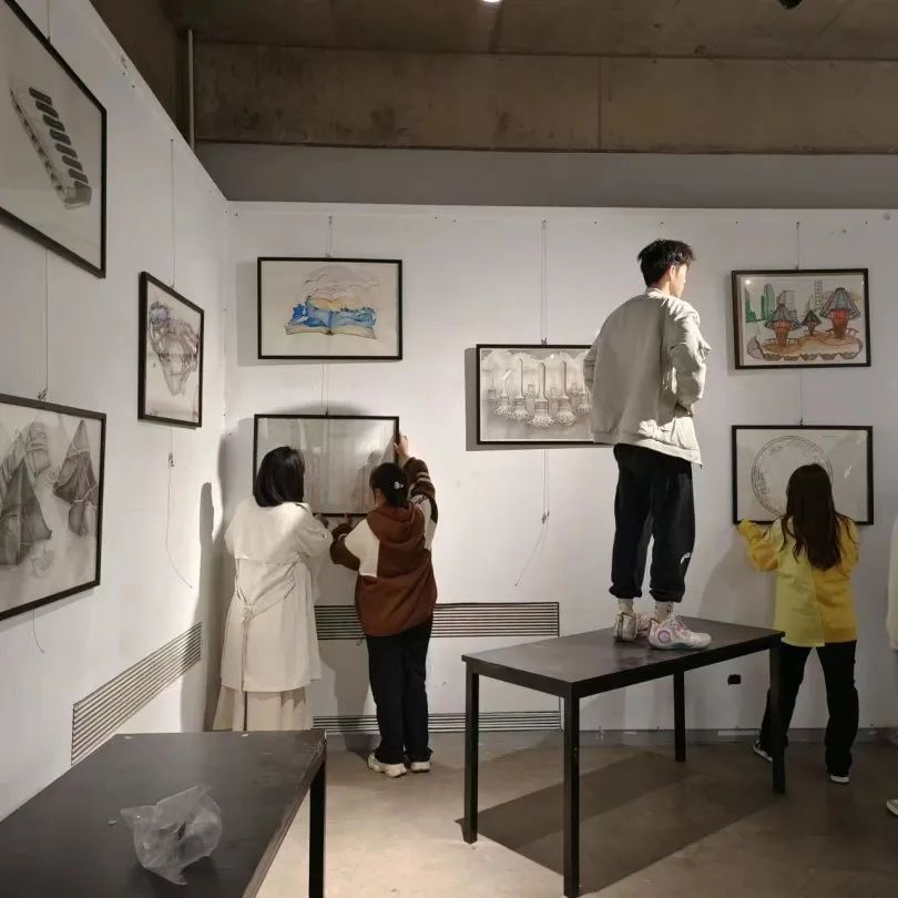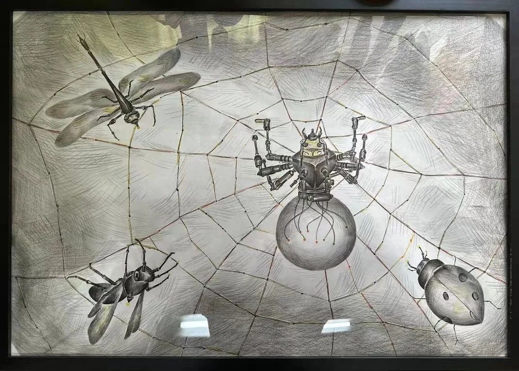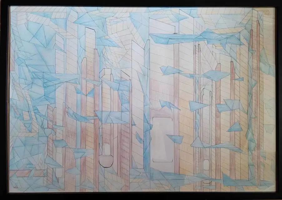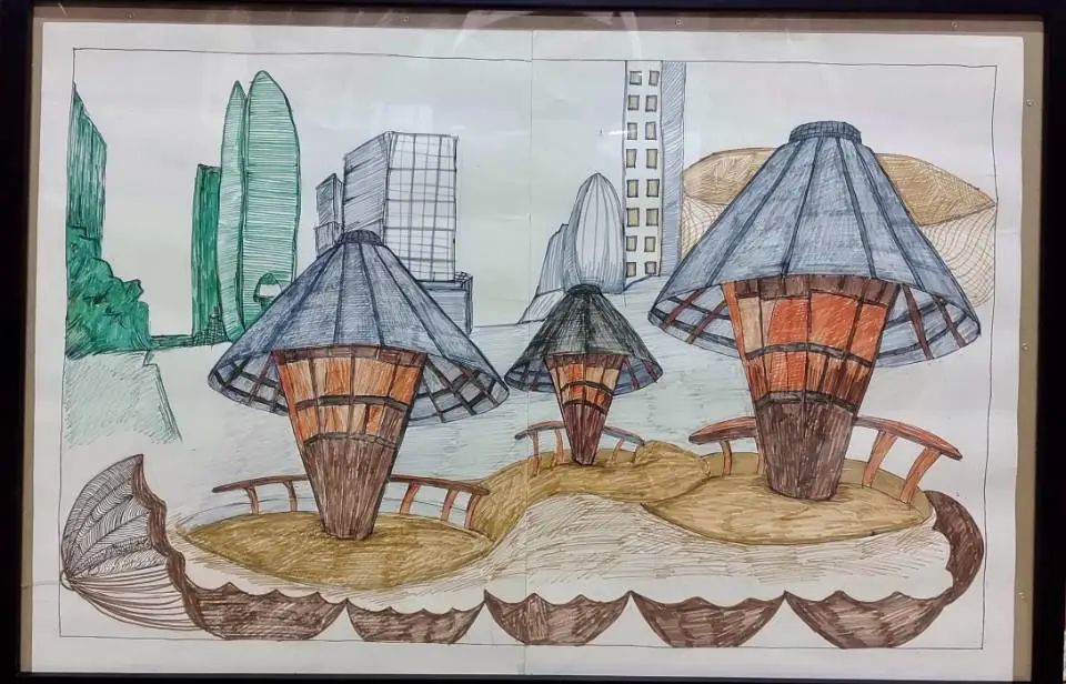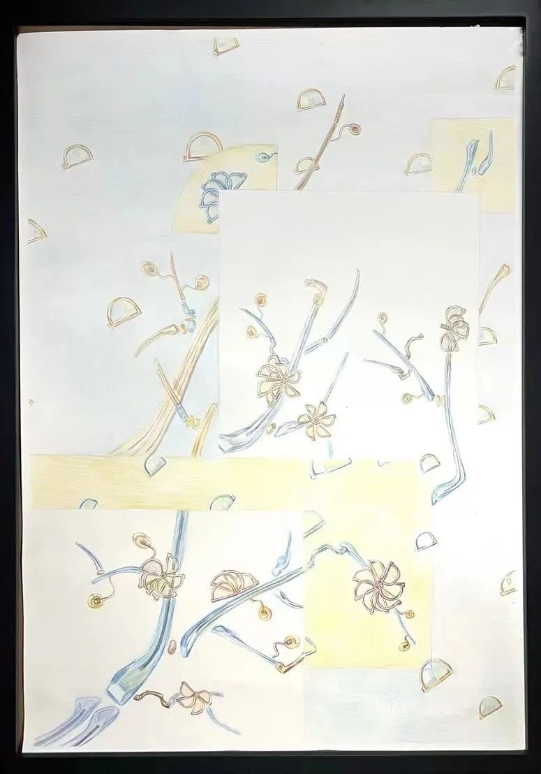 设计说明:作品是以元素A为夹子,元素B为建筑,利用了夹子A元素的真实面貌组合成新的建筑,可以从不同角度看,利用夹子做的这个建筑比一般建筑更具有通透性,仰视从建筑底下看,不在建筑里,又感觉身处建筑中。在作品中着重刻画夹子的细节,使其贴切,利用彩铅以及水彩的工具,让人们在图像化的时代驻足。