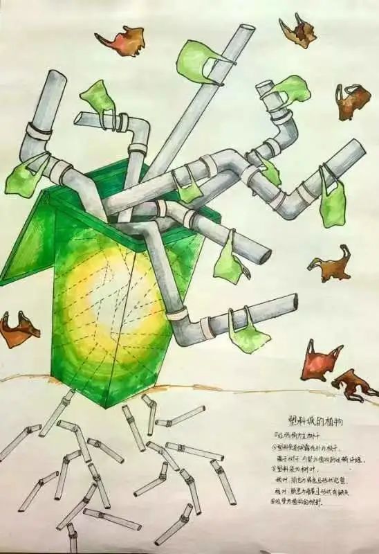 设计说明:现如今塑料横行,全球生态受到威胁,无论是土壤还是海洋都备受折磨,我们已经不能再忽视这一现象!因此我将代表着绿色与环保的大树,塑料垃圾桶、塑料吸管、管子和塑料袋相结合,创造出代表着“希望、生态与废品平衡”的聚乙烯的树希望能够起到警示大家的作用!