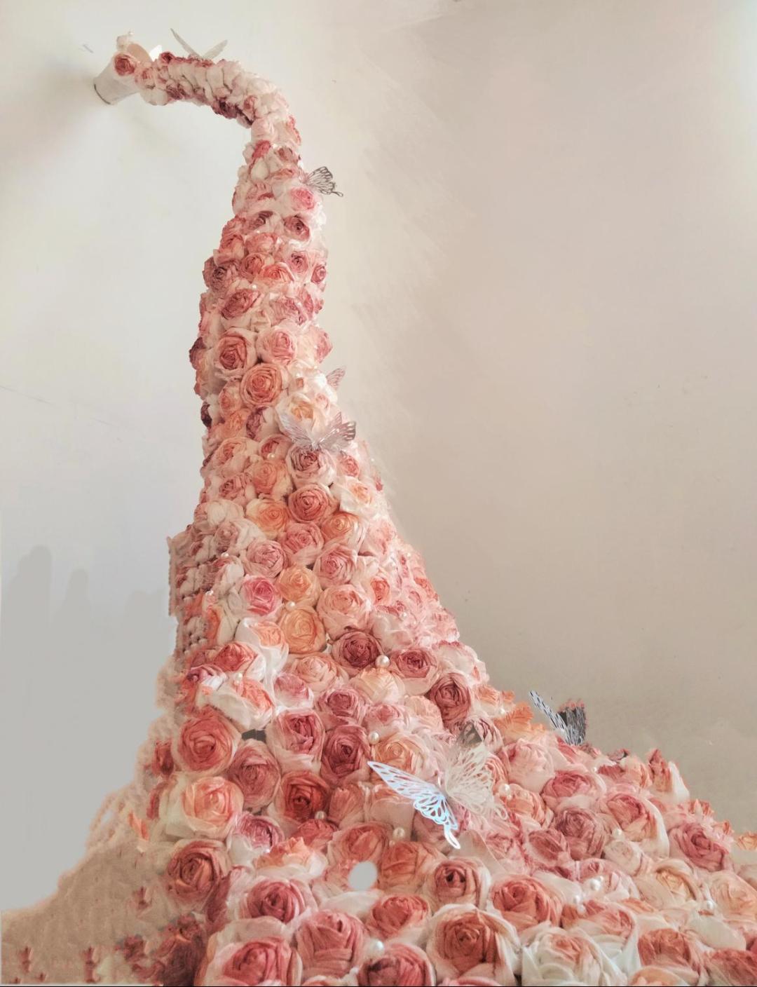 设计理念:将渐变粉色石英砂肌理画以及纸叠玫瑰花作为主视觉元素,给人一种柔和而温暖的感觉,传递出一种温馨和浪漫的情感,黑色裂痕则象征着生活中的伤痛和不完美之处,珍珠则象征着纯洁和美丽,而怀旧英文报纸则为整个作品增添了一份艺术气息和历史感。通过展现不同材质和元素的对比和融合,展现了柔美和浪漫的一面,又传达了对生活中伤痛和不完美的思考和反思。
