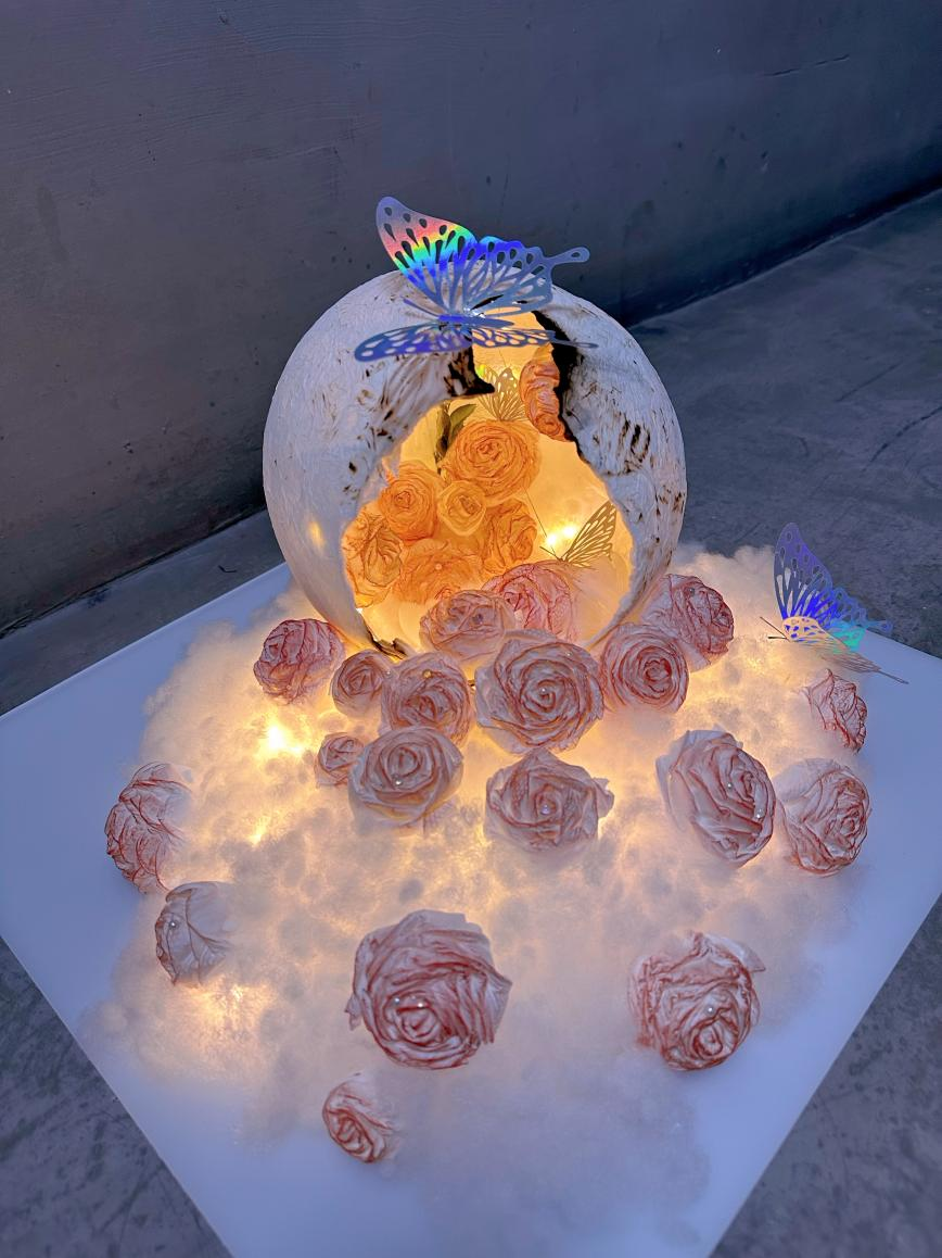 设计理念:蝴蝶翅膀和郁金香结合,传达强烈的美和自由。材质的巧妙运用,增加作品的纹理和触感,粘土材料表现郁金香的质感和层次感,保持作品的稳定性,石英砂增加作品的肌理性。