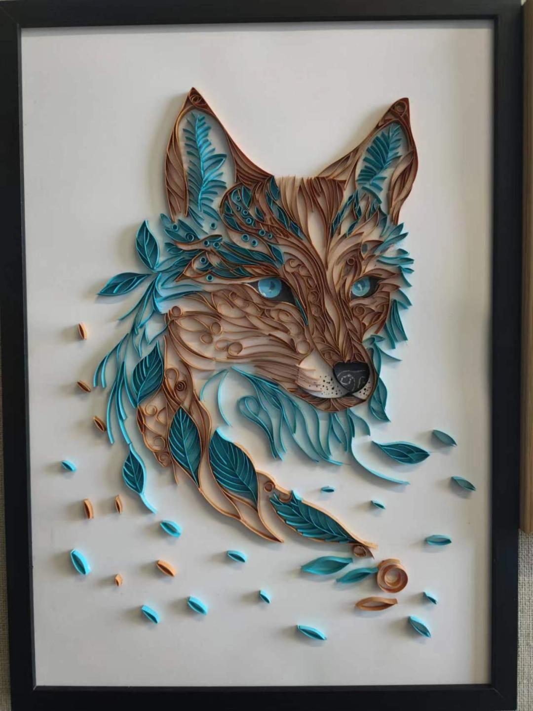 设计理念:本次设计是关于动物题材的衍纸艺术作品,运用棕色和蓝色两种主色,将衍纸条进行卷曲、弯转、折叠等工艺处理,再进行粘连制作,形成了一幅精彩的衍纸作品。