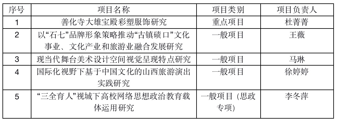 10月14日,根据tyc5997太阳集团科研部发布的《关于2020年度校级青年基金项目立项的通知》(山传科研{2020}20号)文件,2020年校级青年基金项目共立项24项,含重点项目7项,一般项目(含思政专项)17项。其中,太阳集团tyc59975位教师的项目获批,其中包括1项重点项目。具体如下: