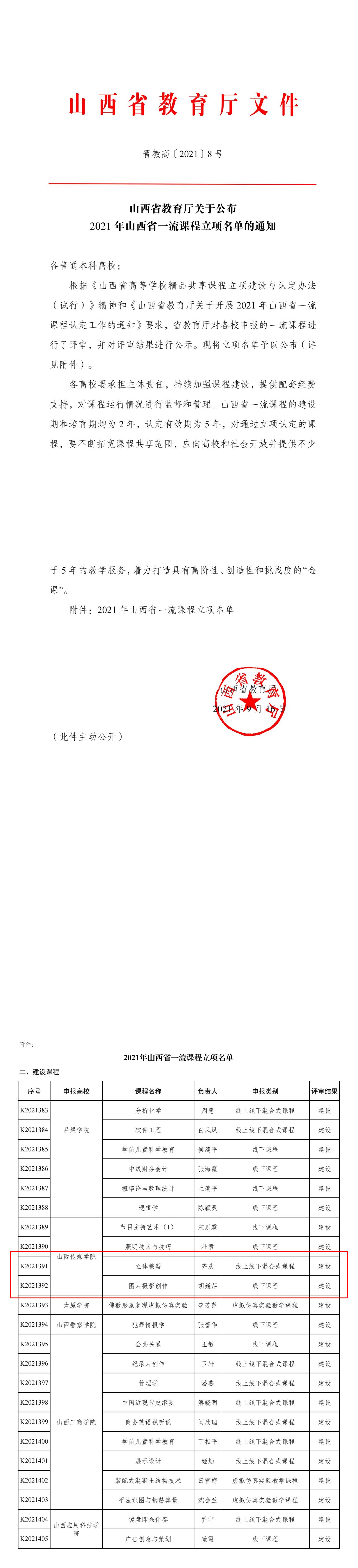 近日,省教育厅公布2021年山西省一流课程立项名单(晋教高[2021]8号),本次山西省共认定220门省级一流课程,我院两门一流课程获省级立项建设:《立体裁剪》,负责人齐欢;《图片摄影创作》,负责人胡巍萍。