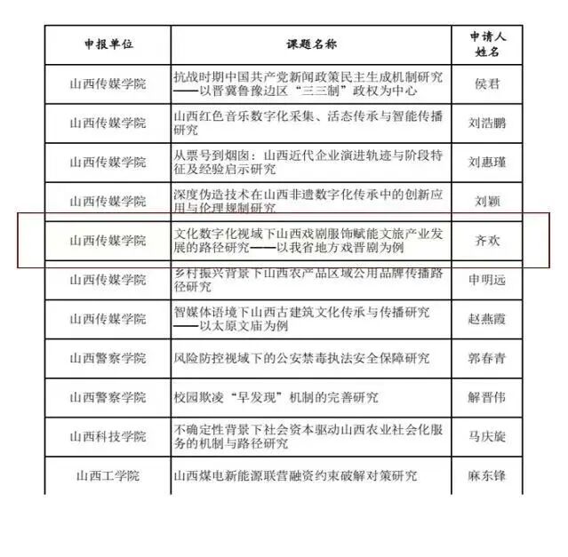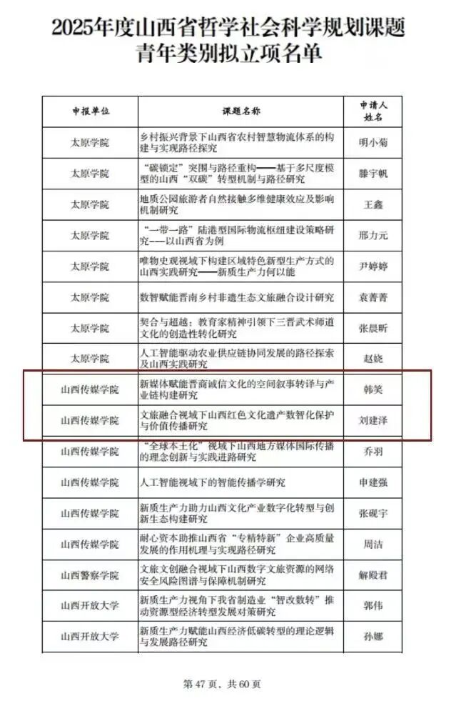 近日,山西省哲学社会科学规划课题2025年立项结果正式公布。太阳集团tyc5997获批五项课题,涵盖重点、一般及青年三类项目。获批课题紧密结合山西文化强省、文旅强省战略部署,聚焦文化传承与创新,彰显学院在服务地方发展中的科研贡献力。