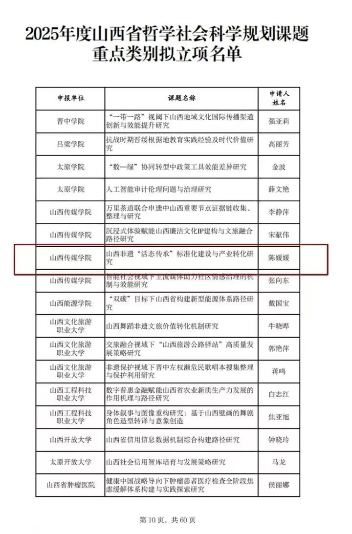 陈媛媛以《山西非遗“活态传承”标准化建设与产业转化研究》获批重点课题。本课题兼具学术价值与实践应用价值,通过标准化建设守护山西非遗技艺的文化内核,增强地域文化认同;同时依托非遗产业发展创造就业岗位,助力乡村振兴与文化强省建设,构建山西非遗项目的标准化产业转化模式,开发文创产品、文旅体验等业态,提升非遗产品附加值与市场竞争力,为山西文旅、文创产业发展注入动能。