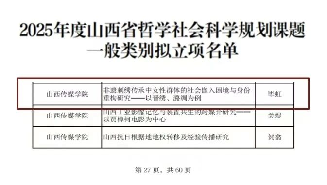 毕虹以《非遗刺绣传承中女性群体的社会嵌入困境与身份重构研究--以晋绣、潞绸为例》获批一般课题。本课题突破非遗传统研究聚焦技艺本体论、传承路径等“物”的维度,创新性地以“非遗传承人”为主体性研究对象,构建“技艺-实践者-社会环境”的三角分析框架。研究以从事晋绣、潞绸技艺女性群体为样本,以社会嵌入理论为基础,关注非物质文化遗产保护进程中容易被遮蔽的“人本维度”。立足山西刺绣个案,揭示手工艺内含的生态智慧和可持续发展逻辑,探索非遗传承与乡村振兴背景下非遗传承女性群体职业化的可行路径,为传统工艺类非遗的“活态传承”提供支持。