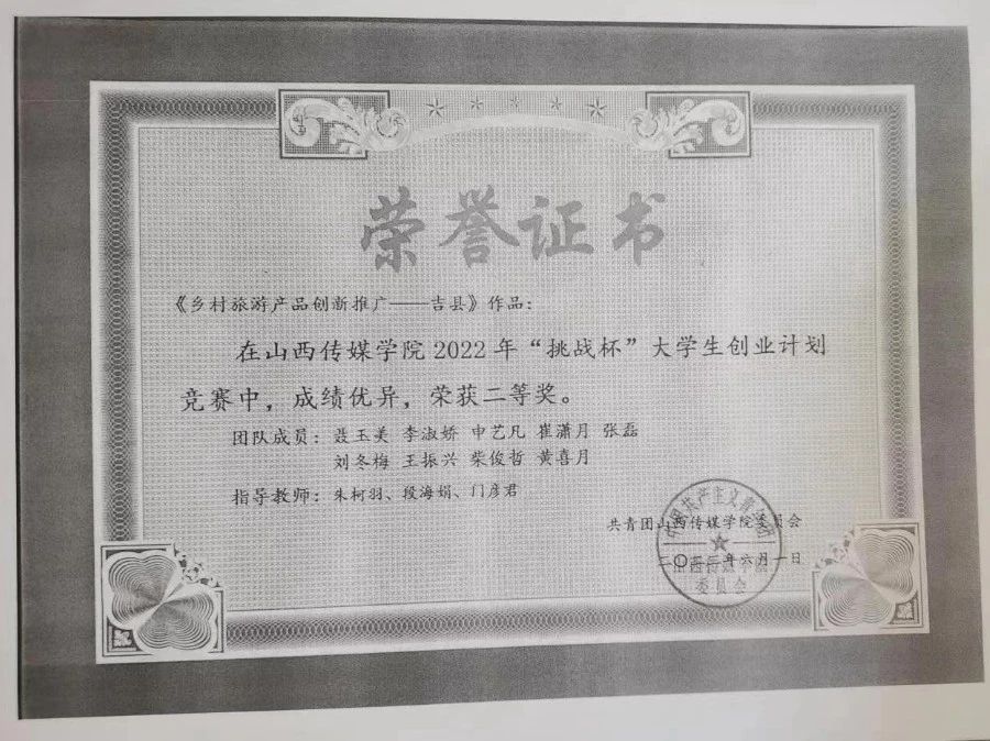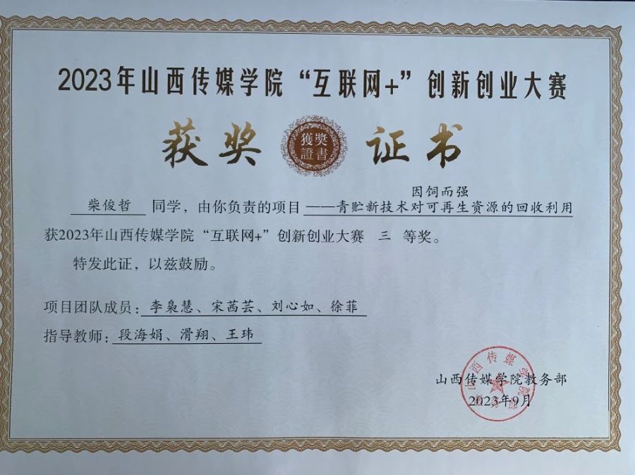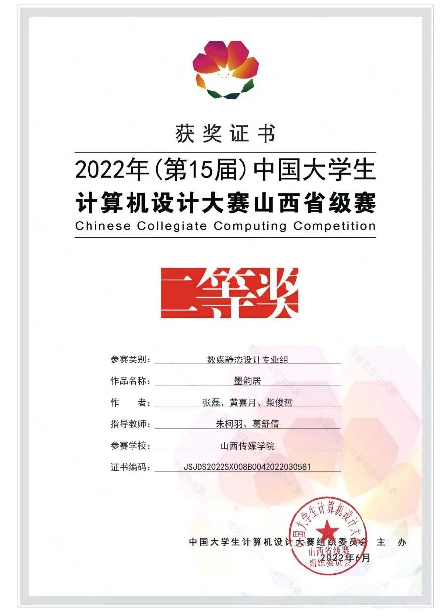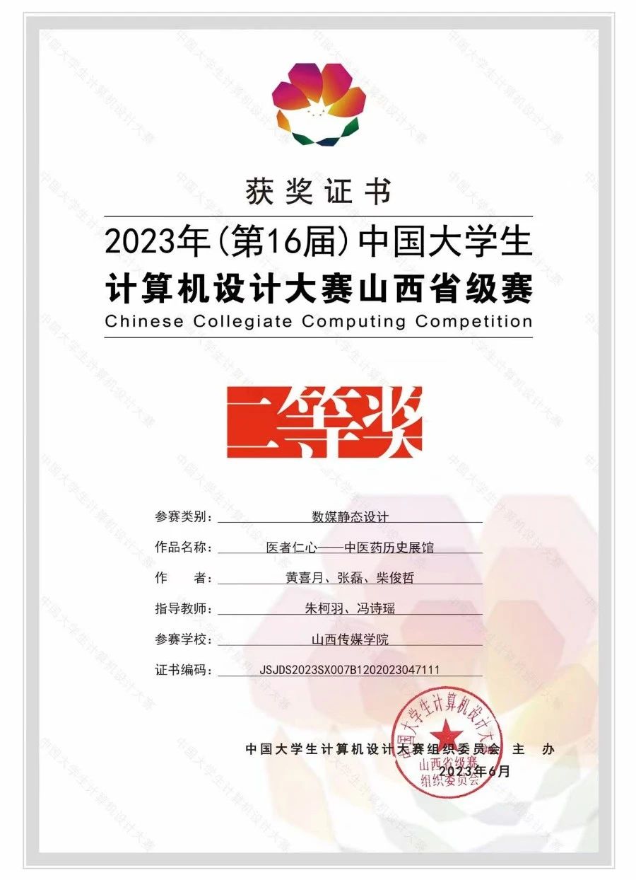 在校期间获得国家奖学金,连续三年获得五次学校优秀学生奖学金、两次国家励志奖学金、三好学生、优秀学生干部、优秀共青团员等荣誉称号。获得2022年(第15届)中国大学生计算机设计大赛山西省级赛二等奖;第十三届“挑战杯”中国大学生创业计划竞赛校级赛二等奖;2022年“互联网+”大学生创新创业大赛校级赛二等奖;第六届“国庆杯全国高校艺术设计作品大赛”学生组三等奖;2023年(第16届)中国大学生计算机设计大赛山西省级赛二等奖;2023年“互联网+”大学生创新创业大赛校级赛三等奖等奖项。