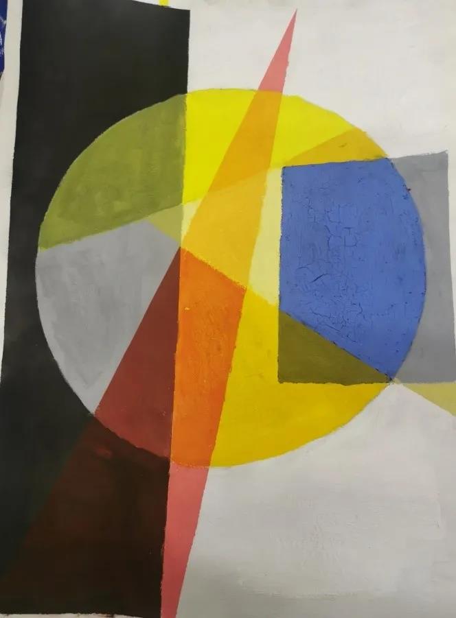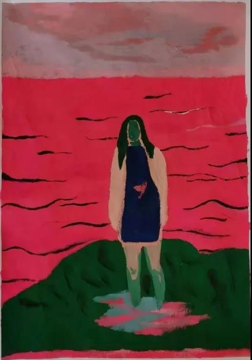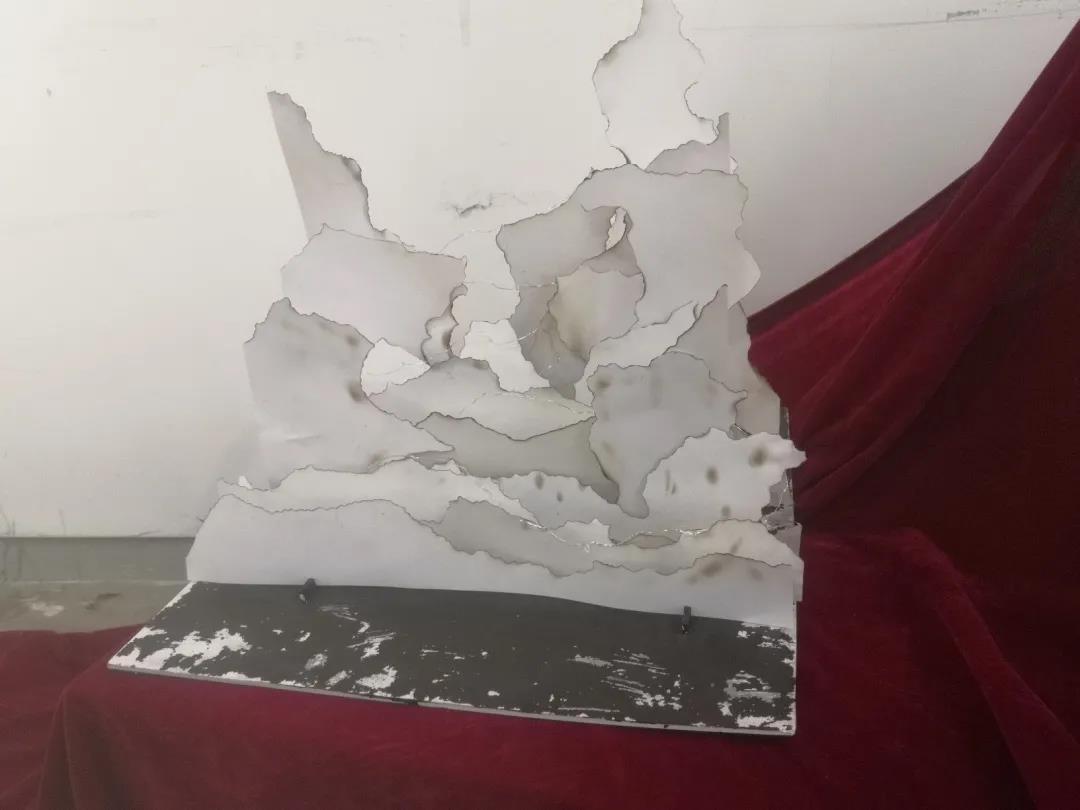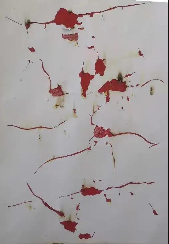不同于用普通画笔绘画,这副画一张纸采用刀刻的方法绘制,一张纸大面积用红色铺底,两张纸合而为一,用刀刮出随意与破碎感,再用火烧的方式增加色彩感与破旧感,并且加入了白色与金色的细沙石。