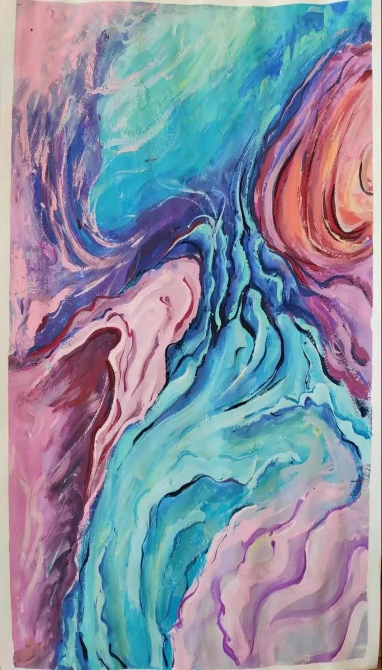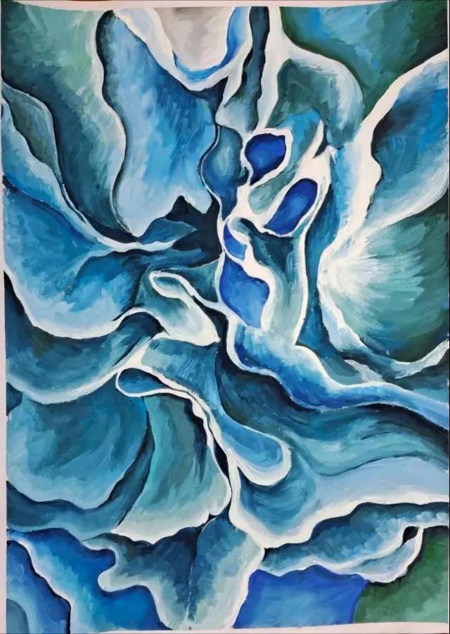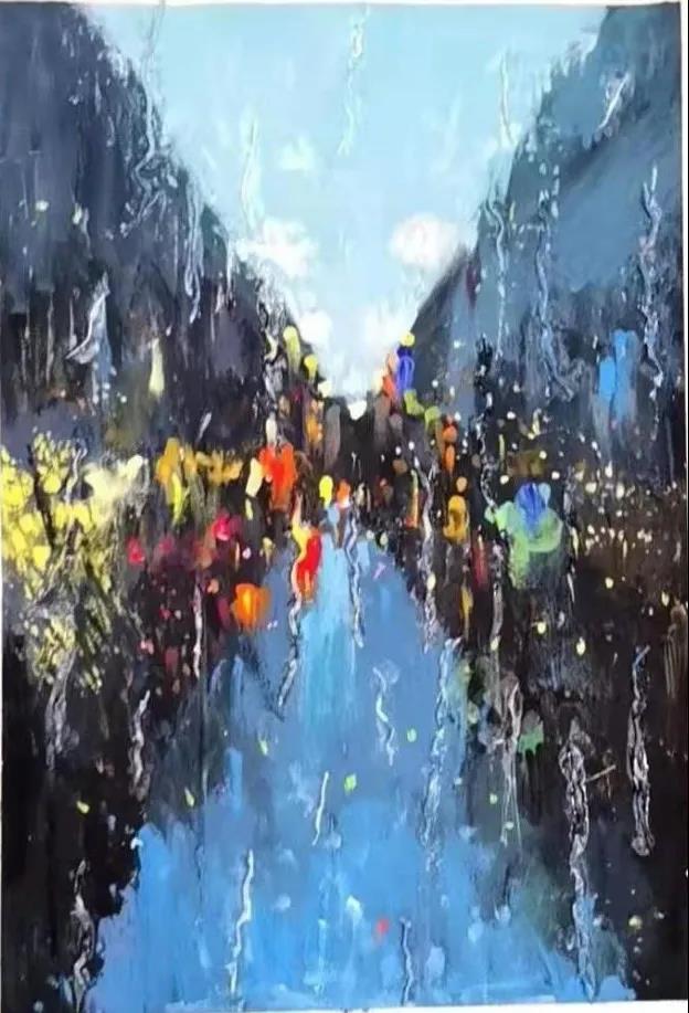 我迷路了,我一动不动的站在街上,我的脑子一片空白,任凭雨水落在我的身上。过了很久。我回过了神,我的目光穿透镜片上的水,那一刻路出现在了眼前。理念来源于花瓣,但是又想打破常规,就加入了不和谐的部分,比一般花瓣要杂乱,以冷色调为主,做成像细沙被流水冲刷的质感,使画给人舒适的感觉。以鲜丽透明的色彩表现阳光与空气的 颤动和明朗的气氛,独具风格。