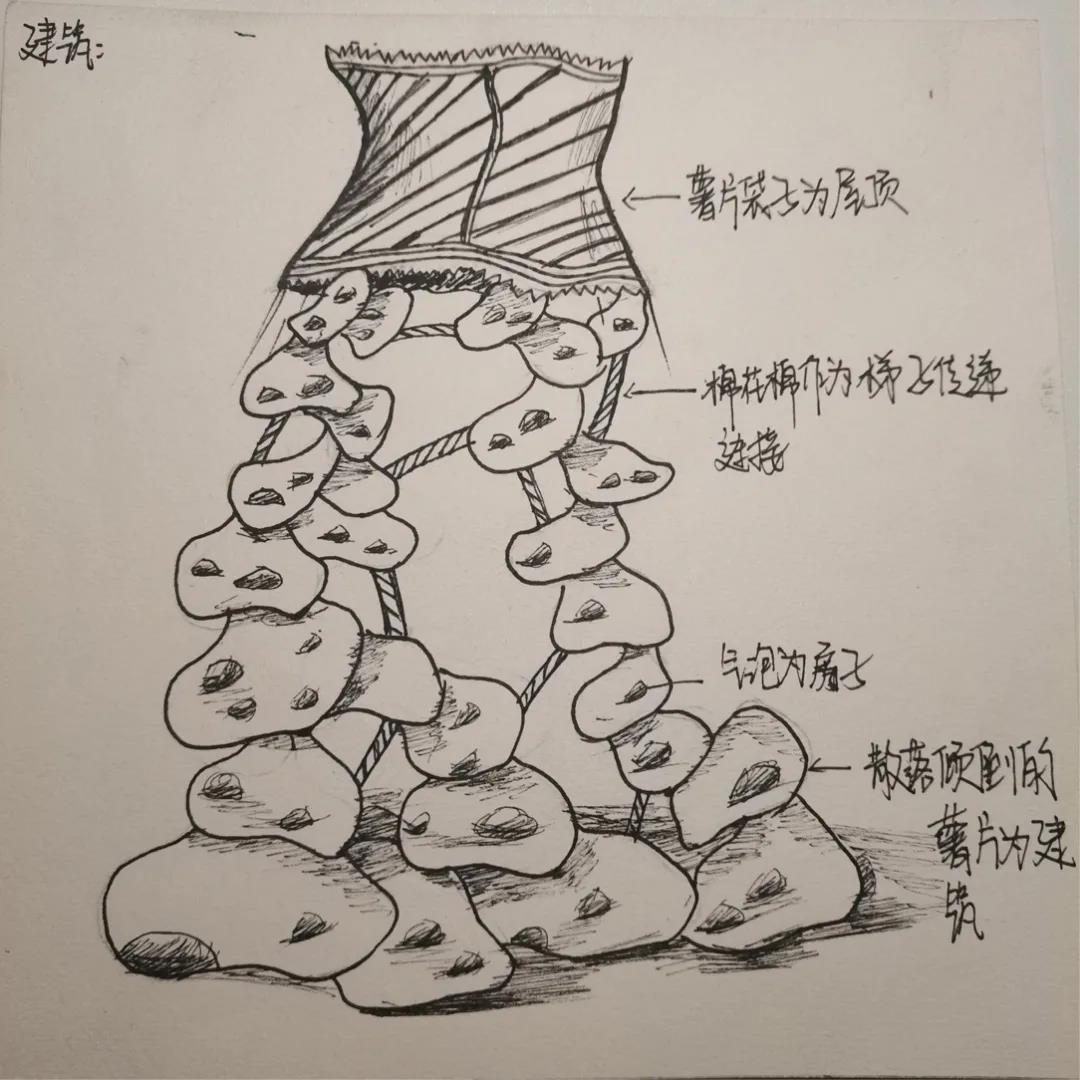 取暖的高塔被放在了最中央,人们总是把心中所想的最需要之物放在中心。而现代人最离不开的东西,信号塔则次之稍低于取暖高塔。高耸的围墙保护着城市的“心脏”。城市飞向空中,支撑柱在旁衬托。将他们最后的希望,升上天花板......