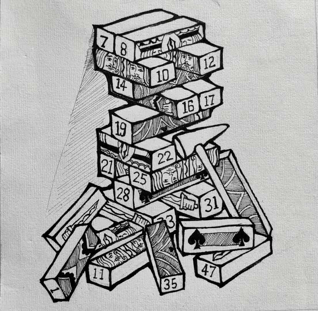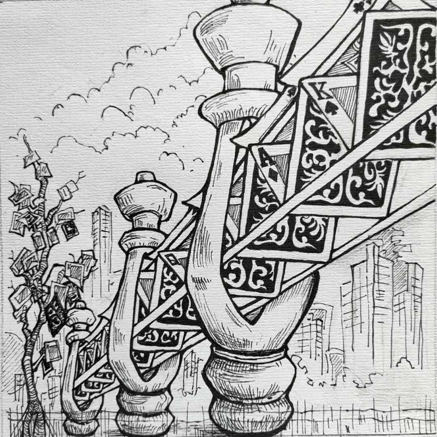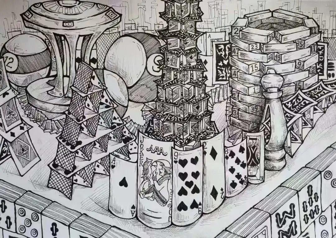 灵感来源自电脑游戏空当接龙,当游戏结束,收牌的一瞬间,重叠交织的纸牌仿佛层峦耸翠的群山,从群山中蜿蜒流淌出的是由纸牌堆砌的河流,造就了一幅新世界的山水。