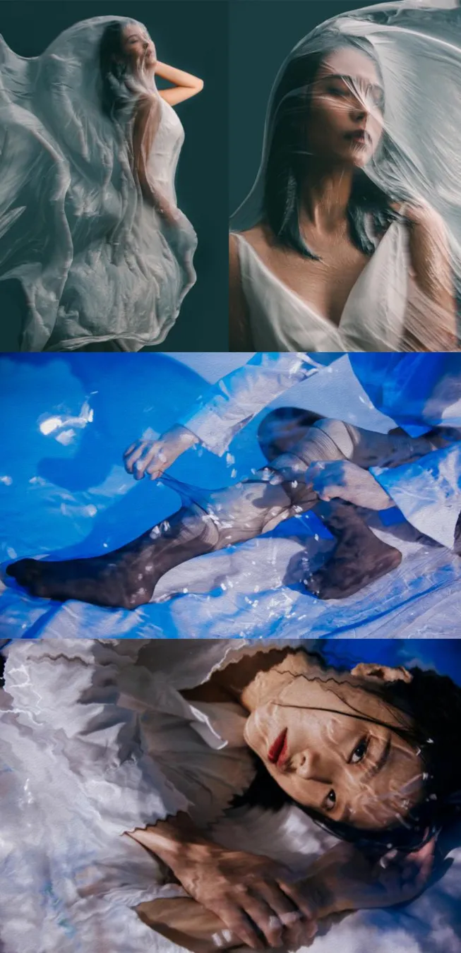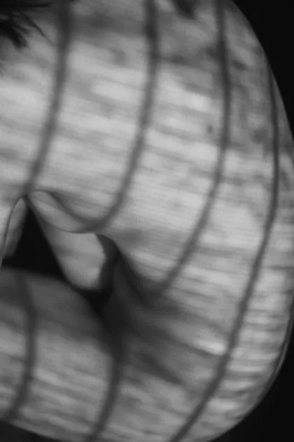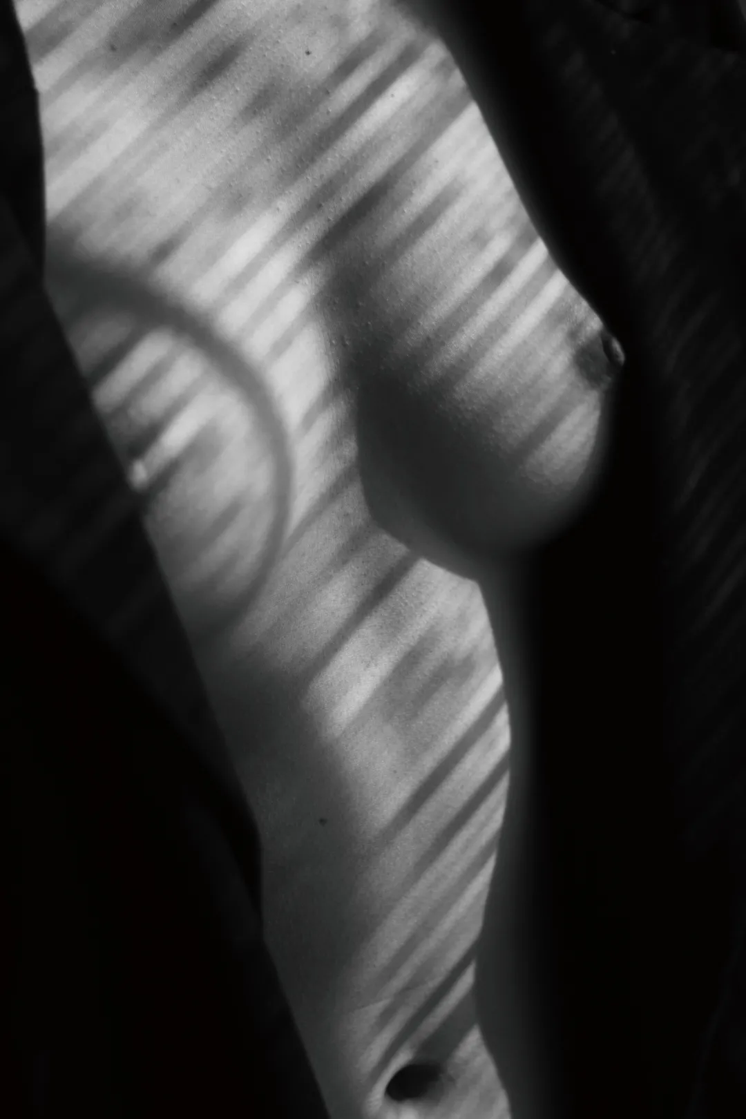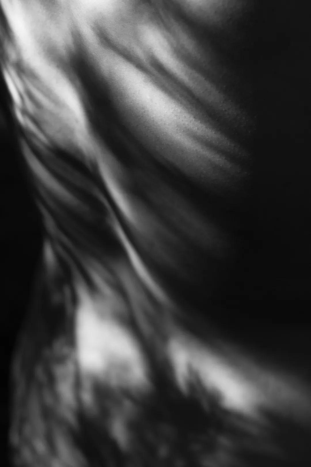 作品致敬吕西安大师,拍摄使用门帘 、日光 、衣服、枫叶等,将人体通过光线半遮半掩纵横交错,于虚实中勾勒模特妙曼身姿。黑白色调,既突出了线条感也表现了人体美。