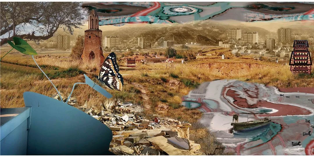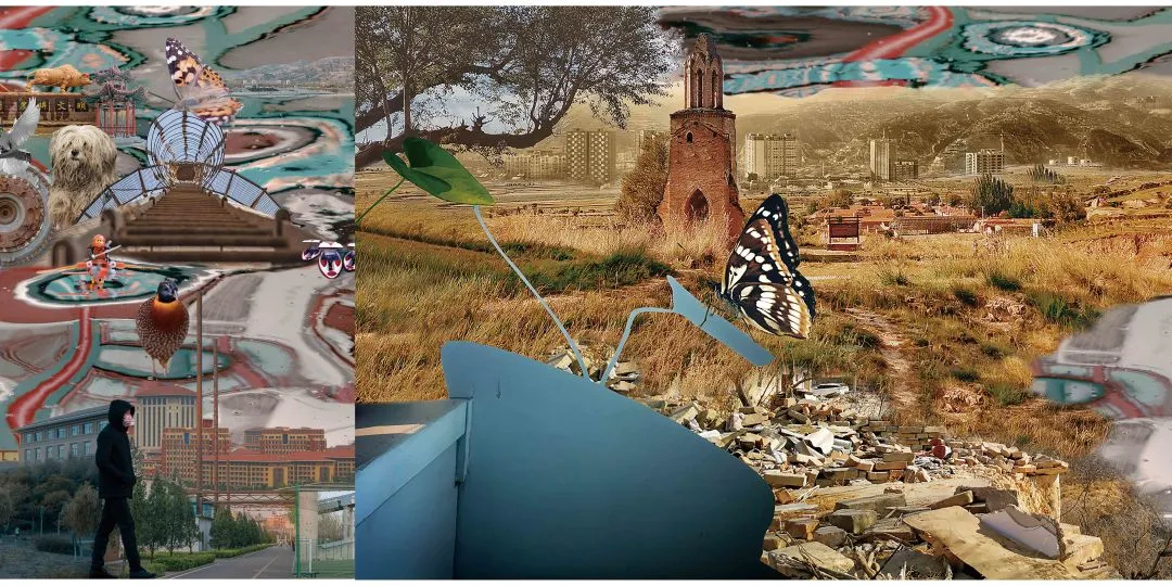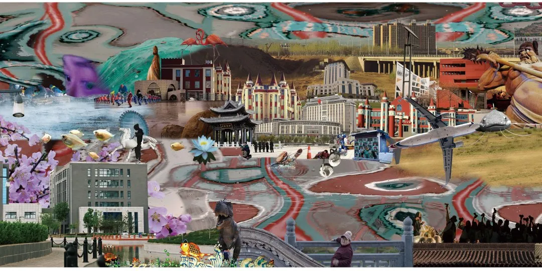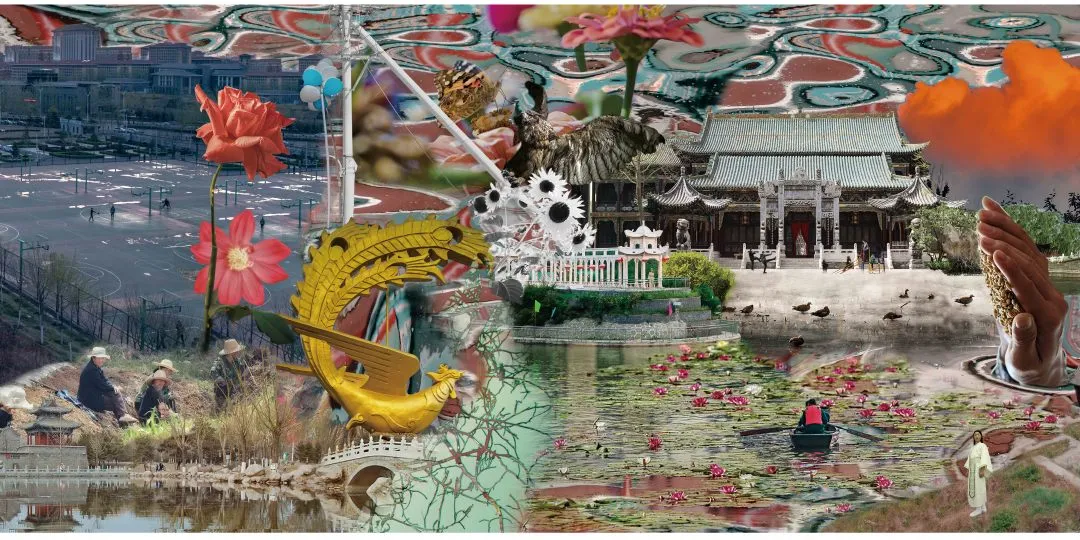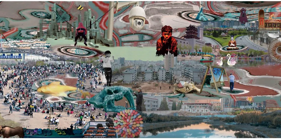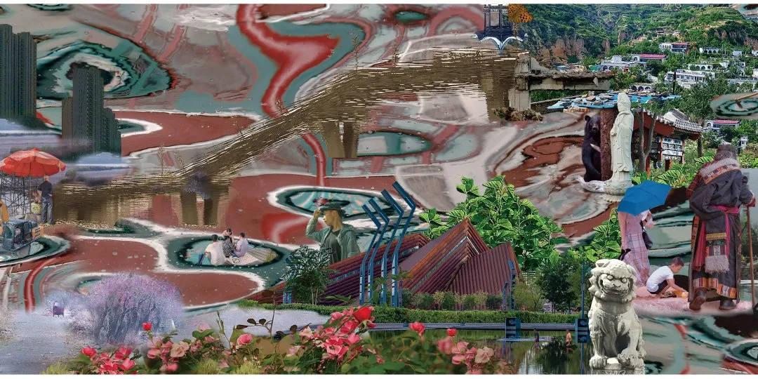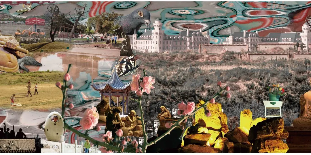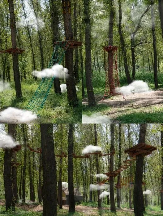 运用拼贴与后期软件合成的手法表现对树林空间的主观想象,静谧的森林修建了几处攀爬设施,打破了树林的宁静又为其增添了几分神秘,朵朵白云似游人玩耍其间,满足了观众的好奇心,提供了一个舒适安逸的“寂静之地”。