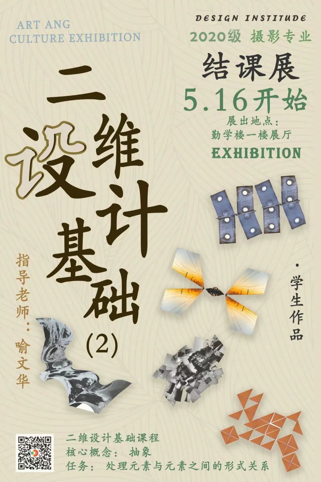 《二维设计基础 (2) 》 是摄影专业的一门专业基础选修课程。该课程针对摄影专业学生的特点,将平面设计专业的构成设计与摄影专业的构图练习结合起来,即通过抽象摄影的方式训练学生对于构成原理的灵活运用,该门课程亦可以称为《构成摄影》。