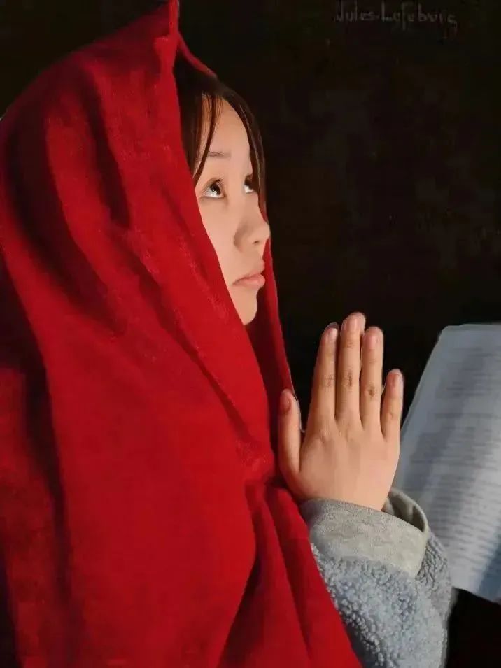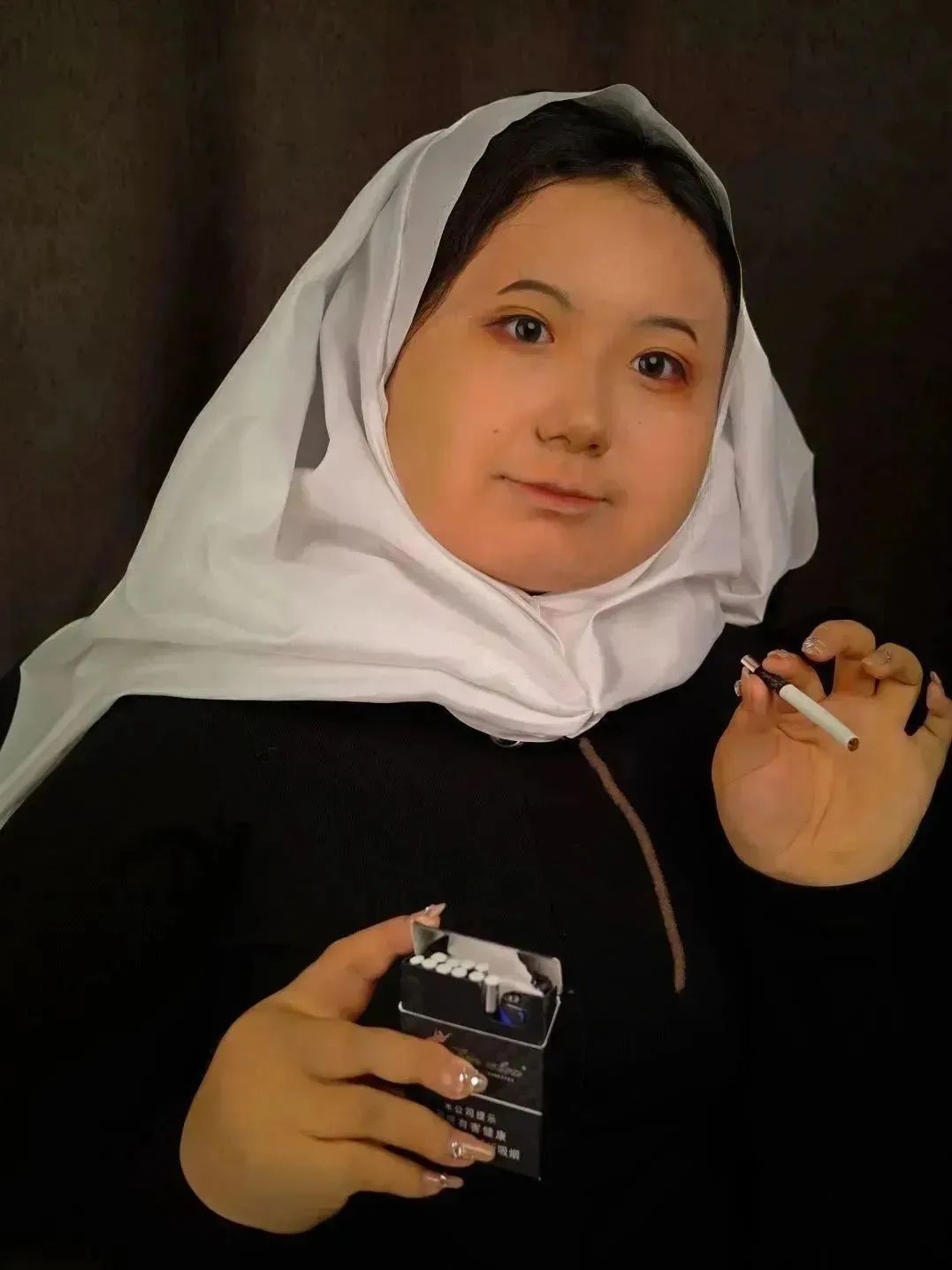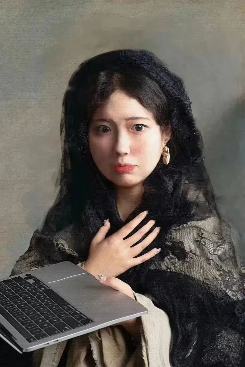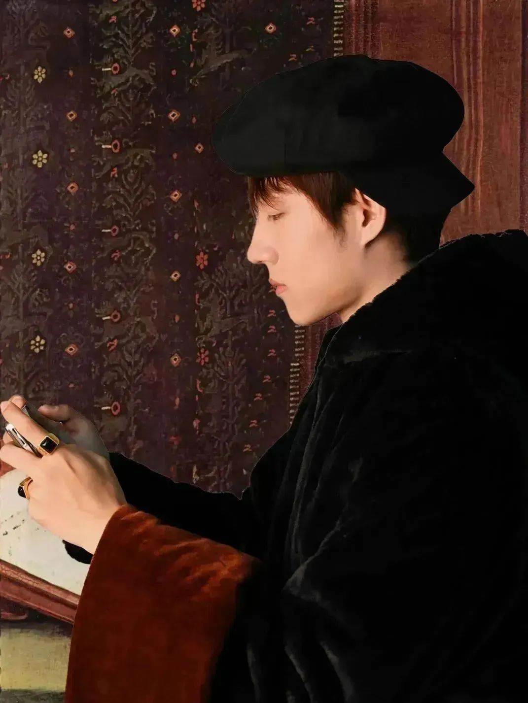 作品简介:第一幅我选用的是《伊拉斯谟像》肖像画,画家刻意表现他在奋笔疾书时的精神状态,也正是看中这幅肖像画中伊拉斯谟专注的目光很符合我预想的主体神态,把他手中的书本换做受当代年轻人沉迷的手机。第二幅我选用的是列斐伏尔《红色斗篷》,一眼看去惊艳又邪魅。同样看中了少女虔诚的眼神,把手中的圣经换作课本,表现出一种临时抱佛脚的感觉。