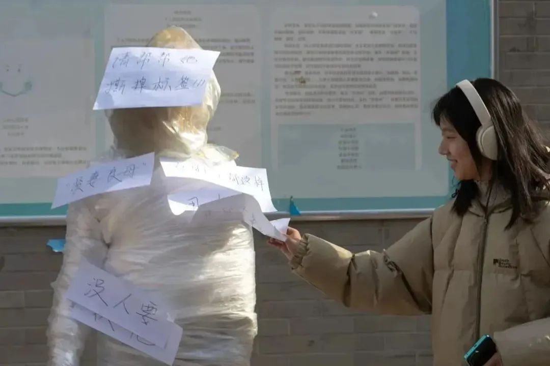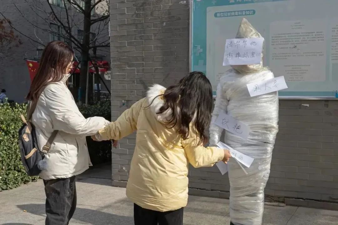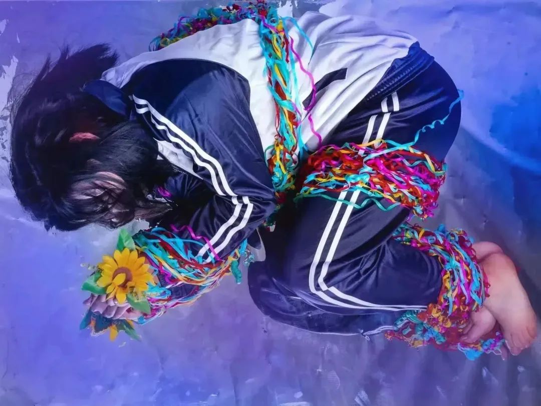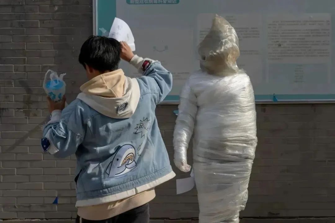 作品简介:作品通过在校园内进行了一次撕标签的行为艺术表演,将自己包裹成一个完全动不了的人,将头也包裹住,这一行为代表着我是无名的,留有一只胳膊是想告诉大家我曾挣扎过,但还是未挣扎成功,让大家将女性身上的标签撕掉,自由自在地做自己。