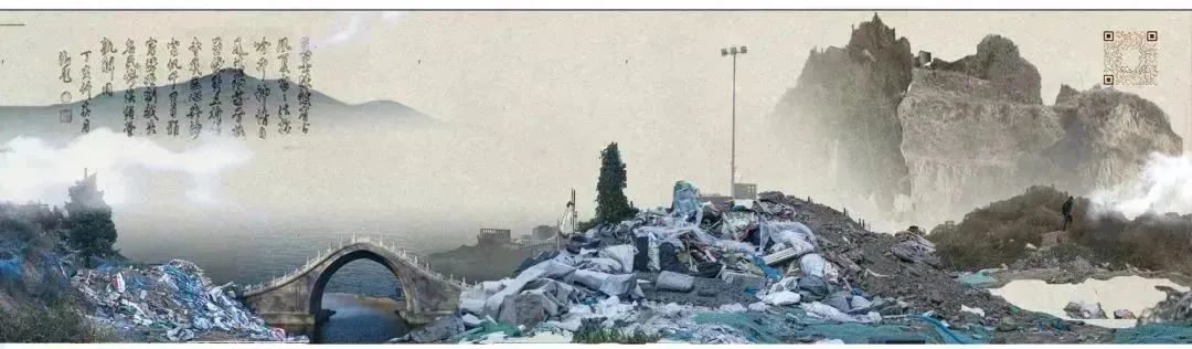 作品简介:借鉴姚璐老师的创作方式,与南宋夏圭的《溪山清远图》相结合,创造出新式山水图。这是人类生活的痕迹,用当代景观替换山水画中的某些图式,创作出一幅“新山水画”。