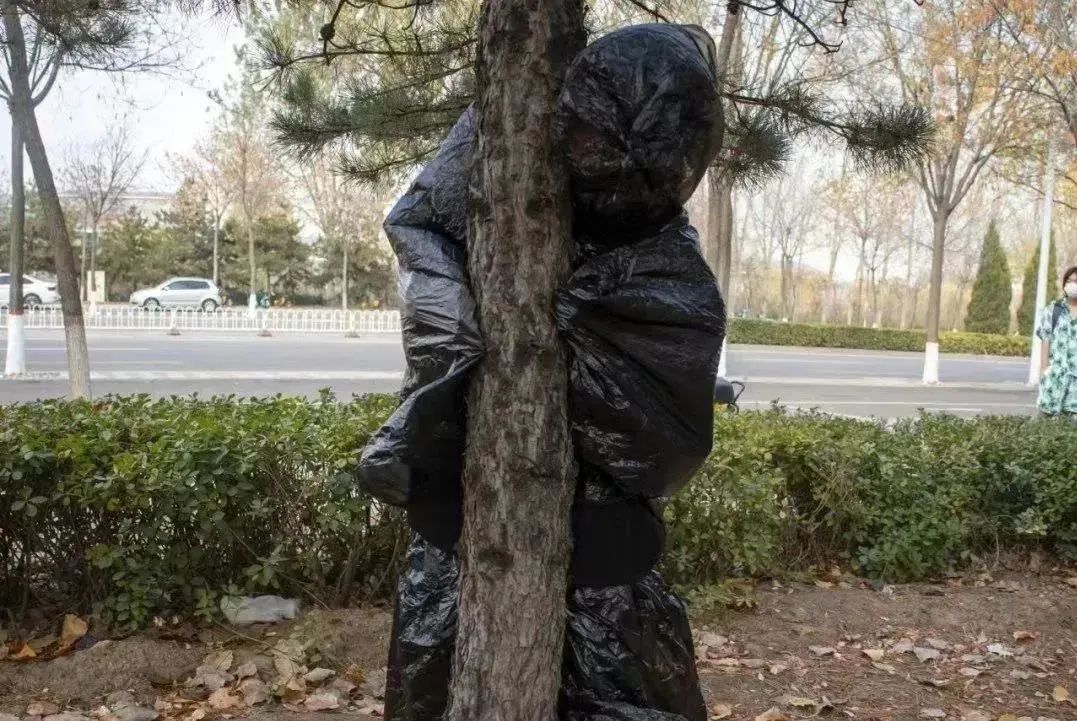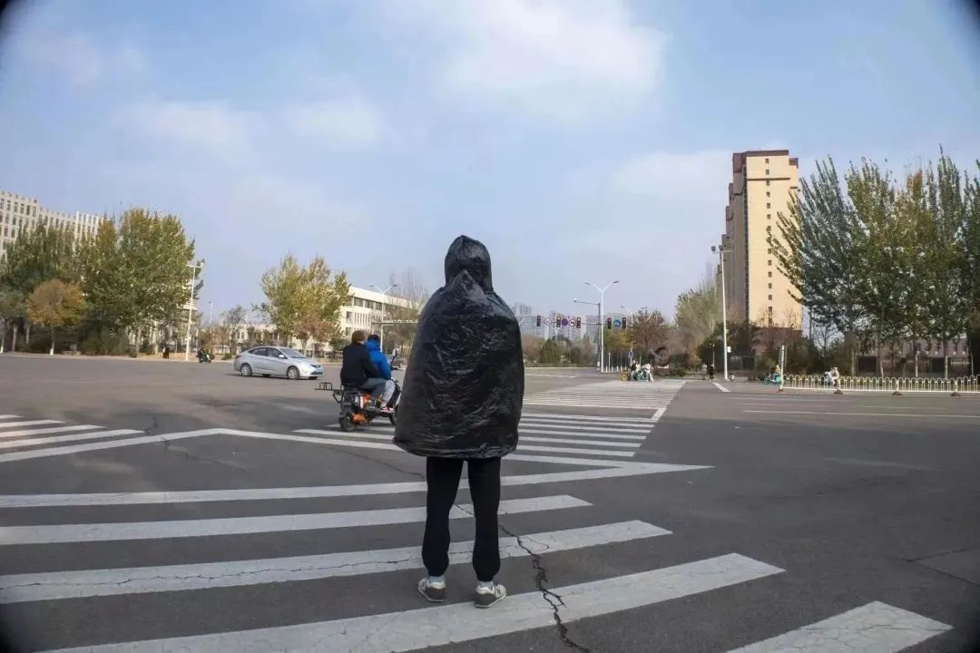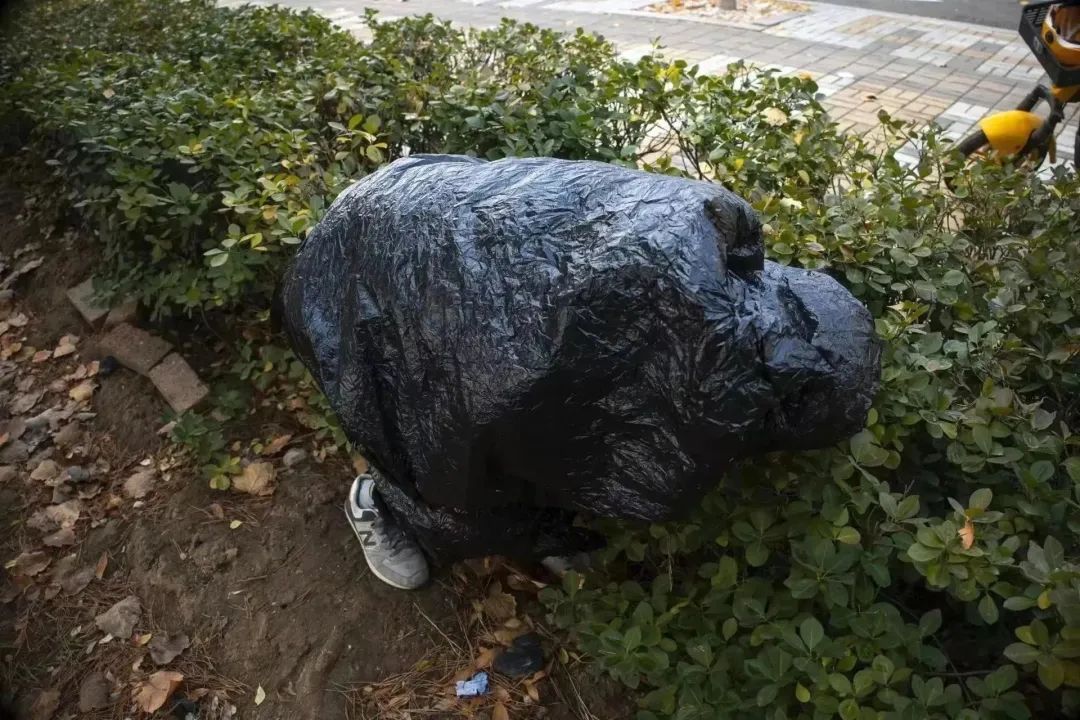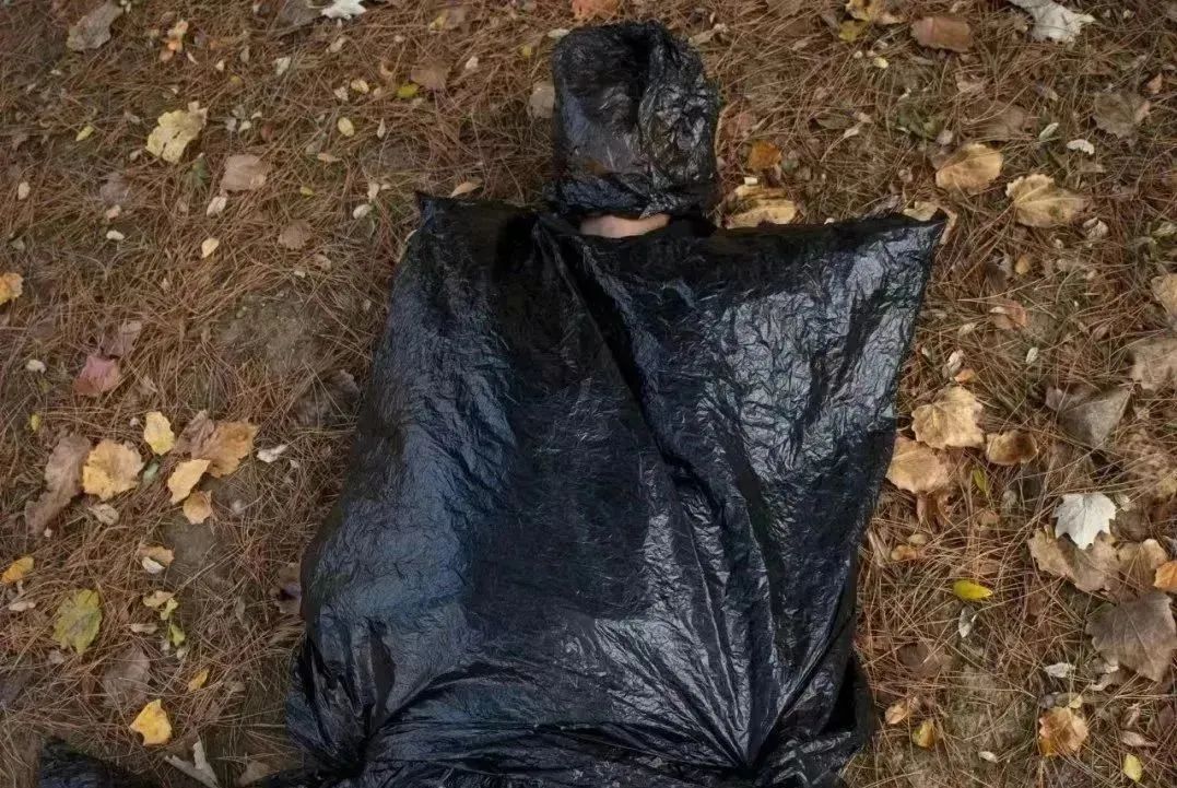 作品简介:用黑色的塑料袋将身体和头部套住,扮演一个被黑色笼罩的人,然后以这种打扮在道路上行走五公里,进行一场现实中的行为艺术。