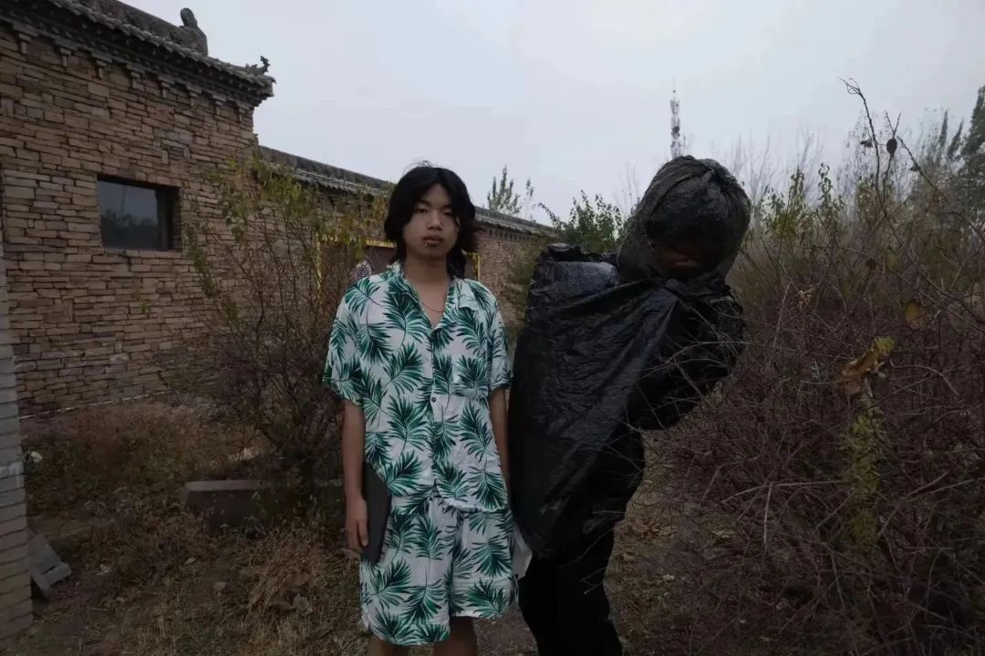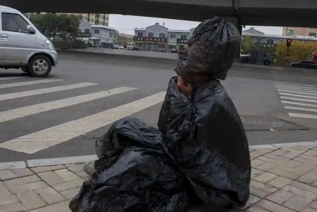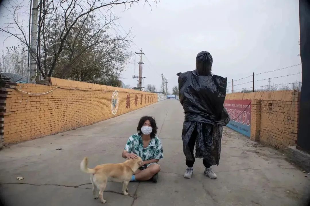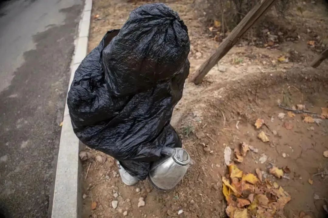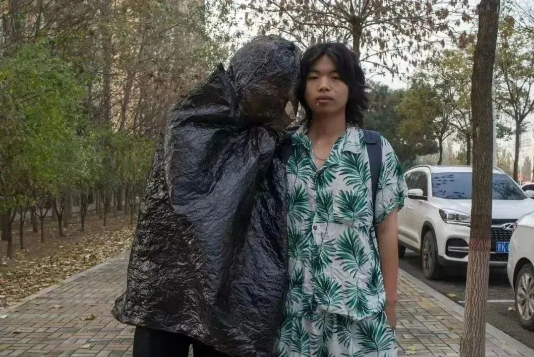 作品简介:用黑色的塑料袋将身体和头部套住,扮演一个被黑色笼罩的人,然后以这种打扮在道路上行走五公里,进行一场现实中的行为艺术。