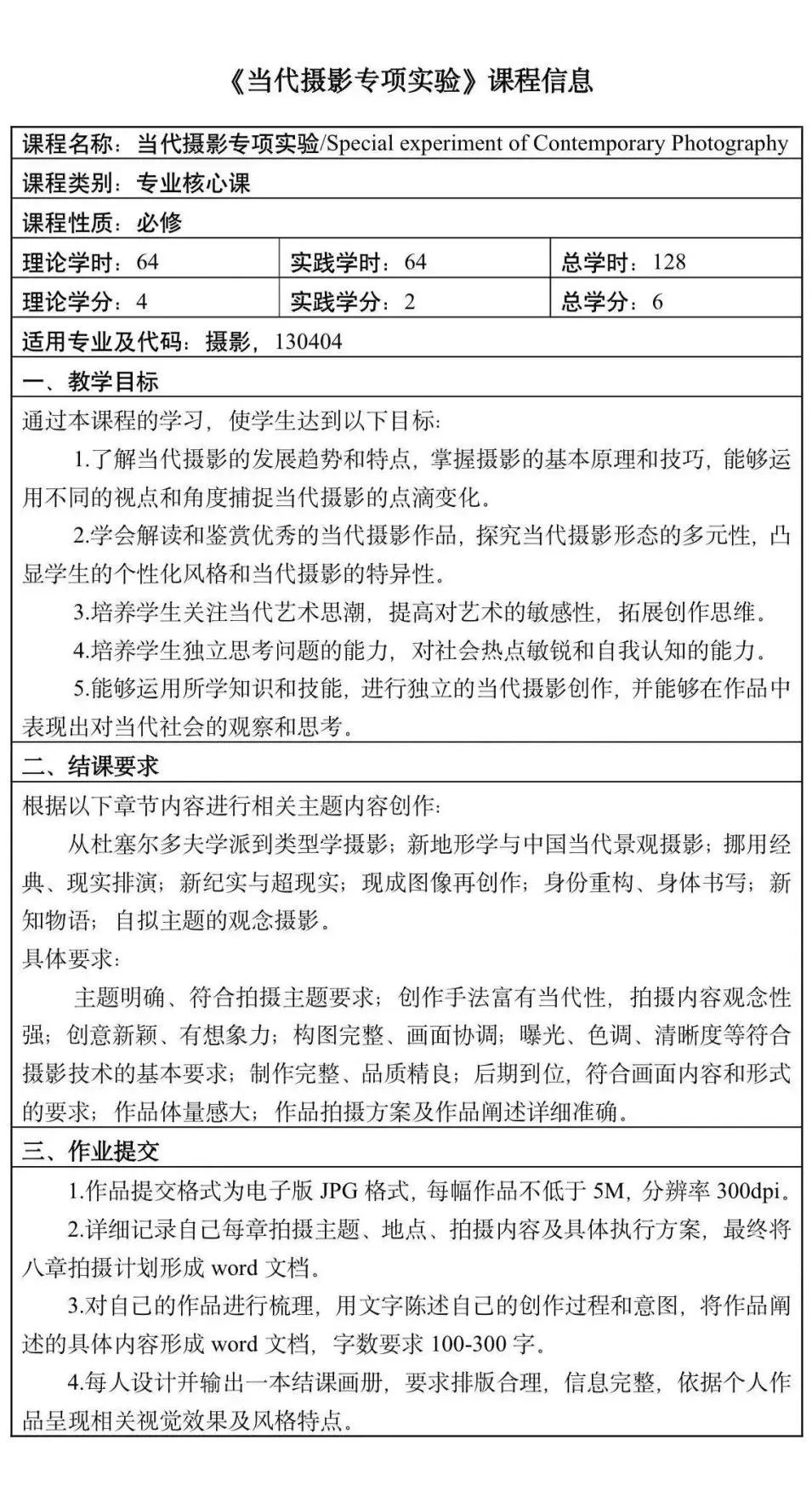 通过该课程的学习,学生可以通过摄影语言表达对当代社会现实的反思,呈现个人视角下的故事、情感、审美及观点,并进行多角度创作实践。当代摄影不仅是记录和表现现实的工具,更是对当代文化和社会变革的回应,它不断演进,同时也在塑造着我们对世界的认知和理解。